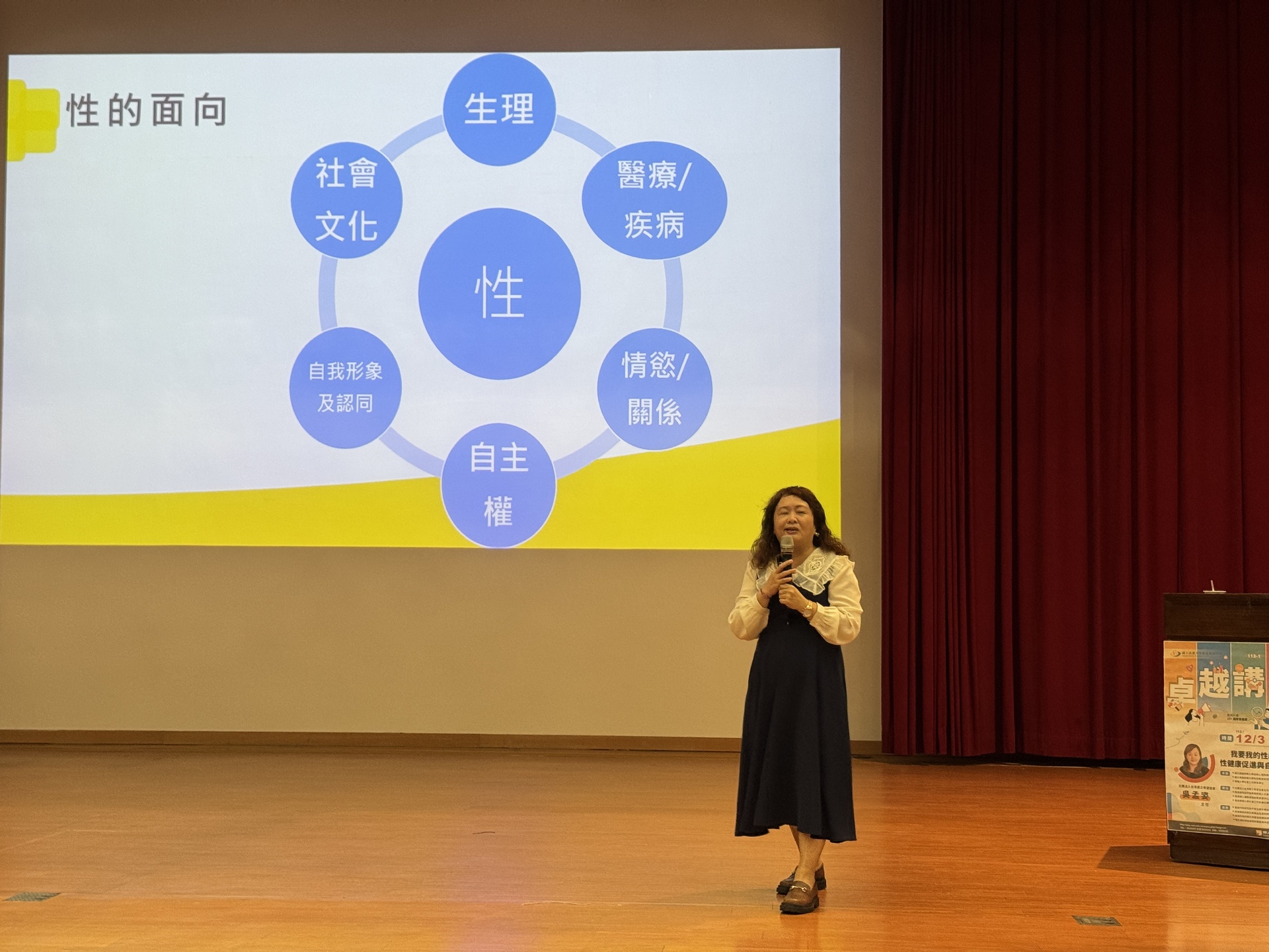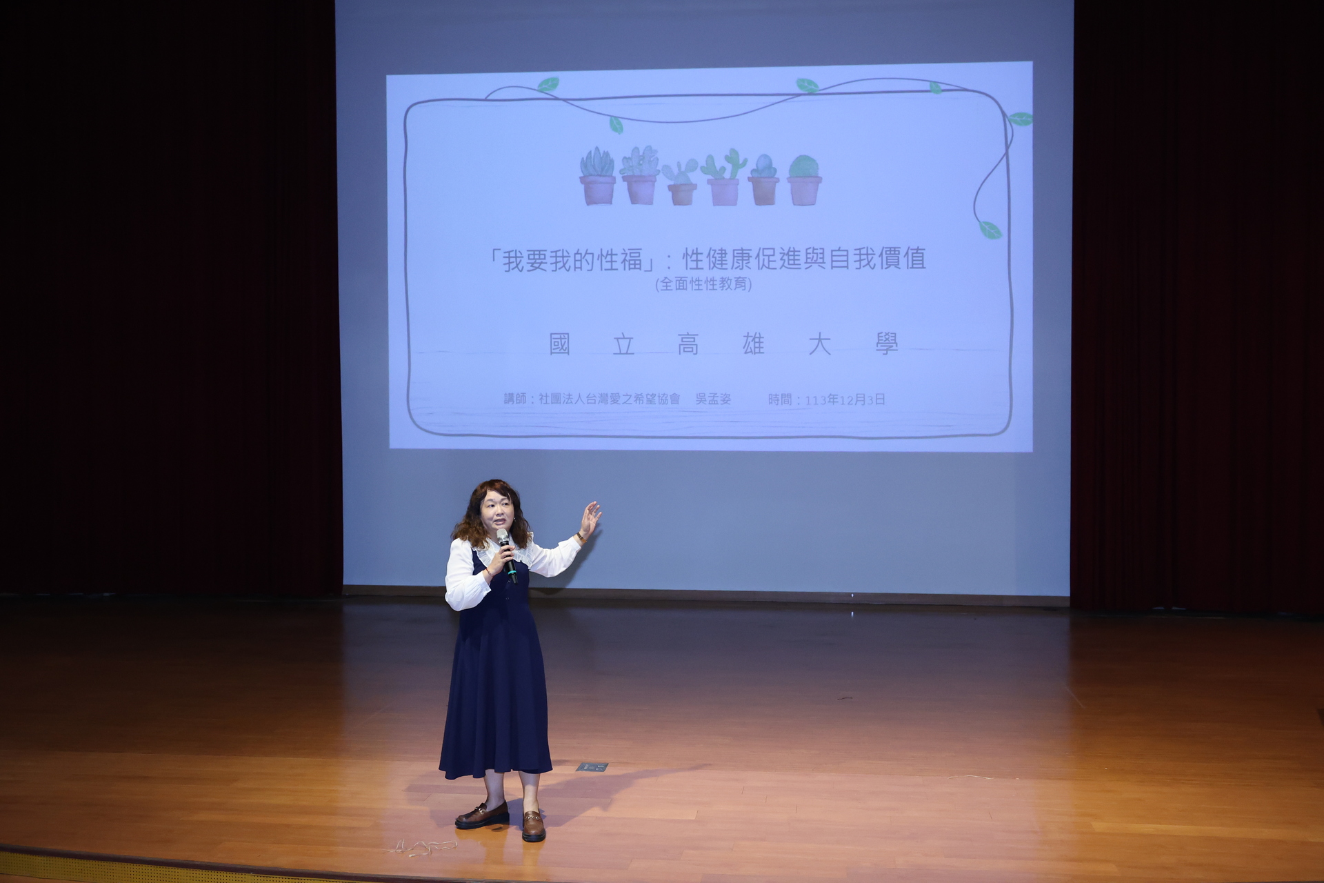 2024-12-03 國立高雄大學《卓越講座》今(3)日邀請台灣愛之希望協會主任吳孟姿以「我要我的性福:性健康促進與自我價值」為題演講,結合學務處「性教育」、「愛滋防治」宣導,響應聯合國世界衛生組織(WHO)每年12月1日的「世界愛滋日(World AIDS Day)」。學務長王明月主持講座,致頒感謝狀予吳孟姿。