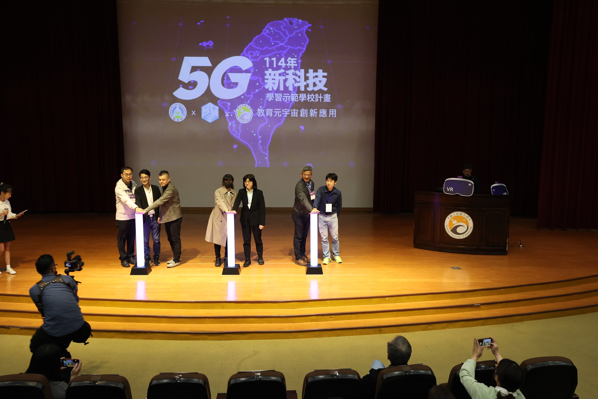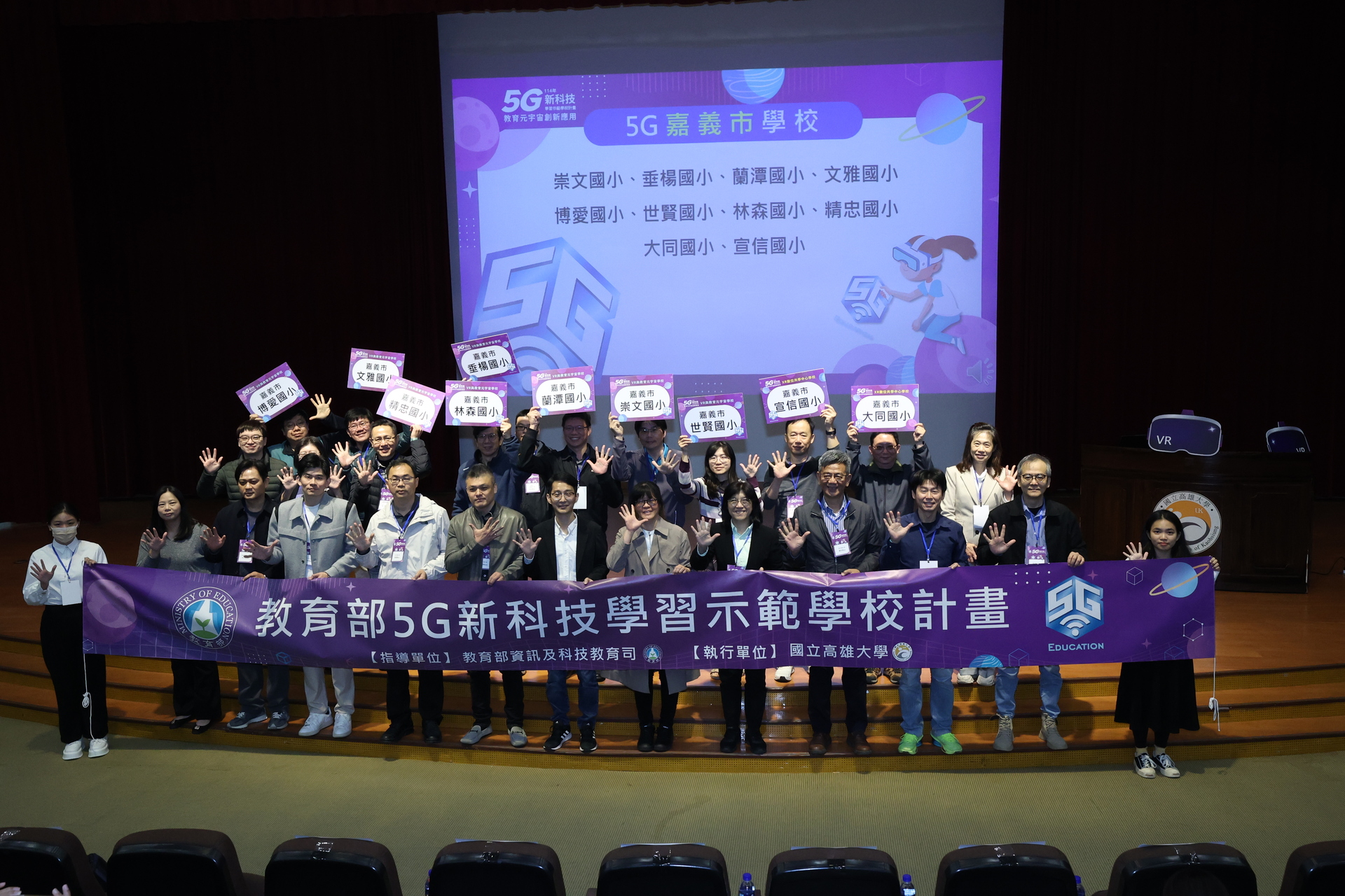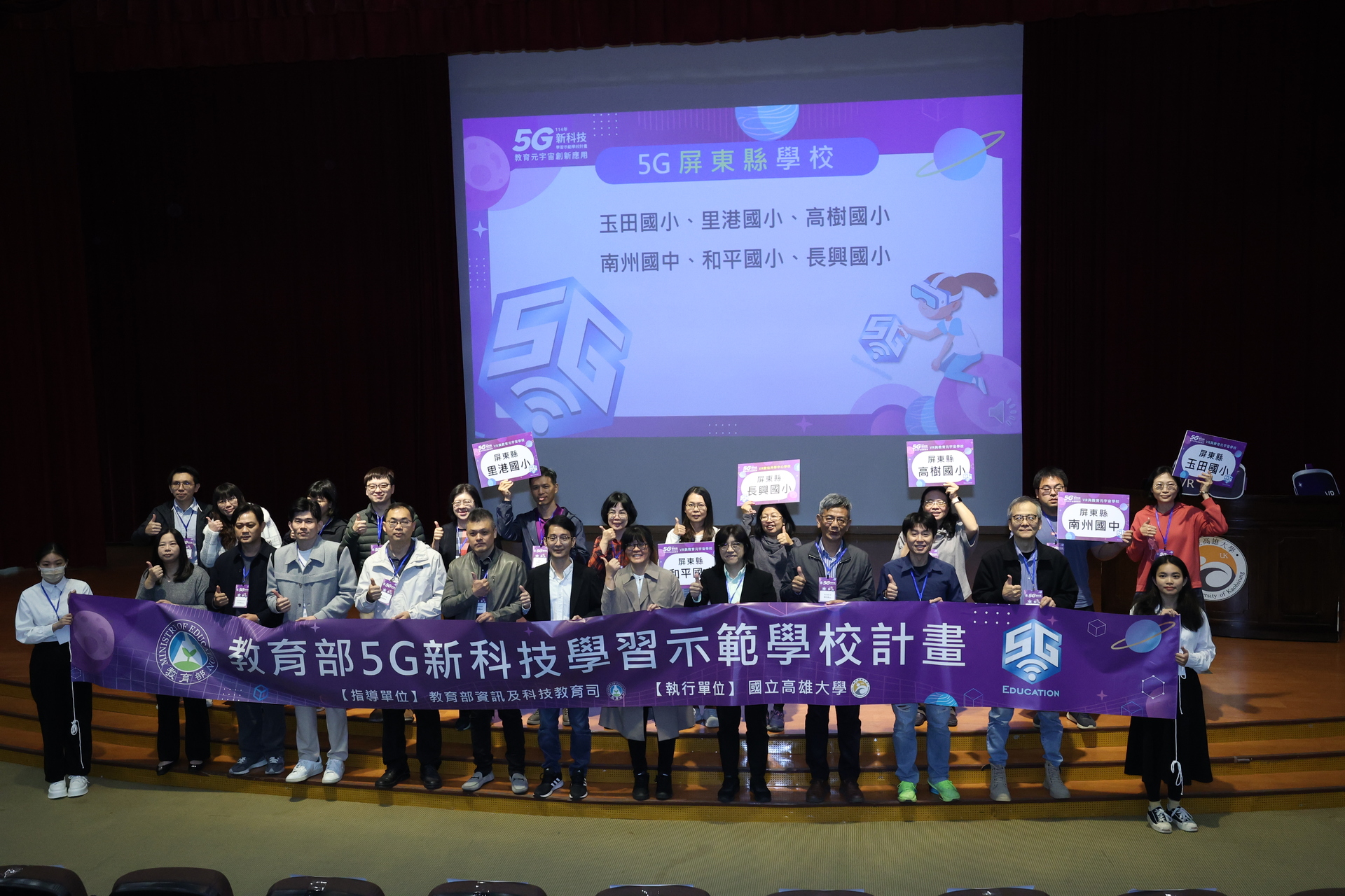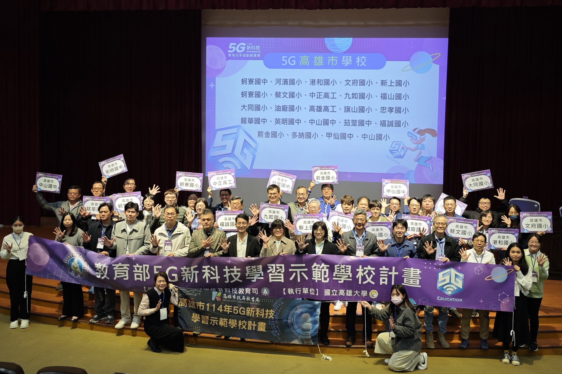 教育部資訊及科技教育司科長鄧慧穎、國立高雄大學學術副校長莊琇惠、主任秘書潘欣泰、教務長張志鴻,以及5G計畫團隊主持人國立清華大學教授吳聲毅、國立高雄大學副教授王政弘、國立台南大學副教授伍柏翰等人,共同以「Give Me Five」手勢啟動5G燈柱,象徵計畫正式展開。