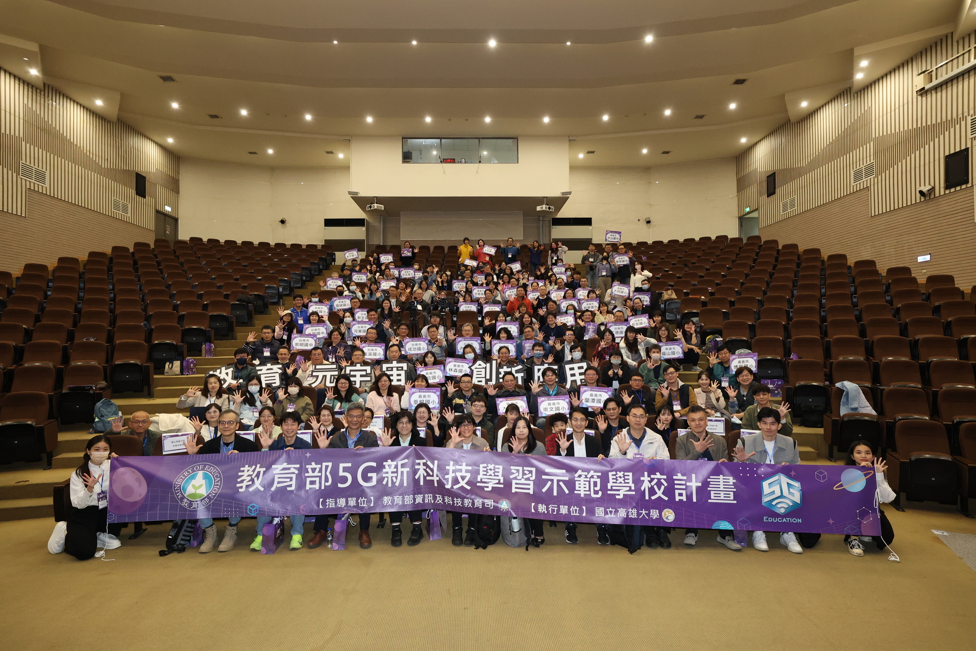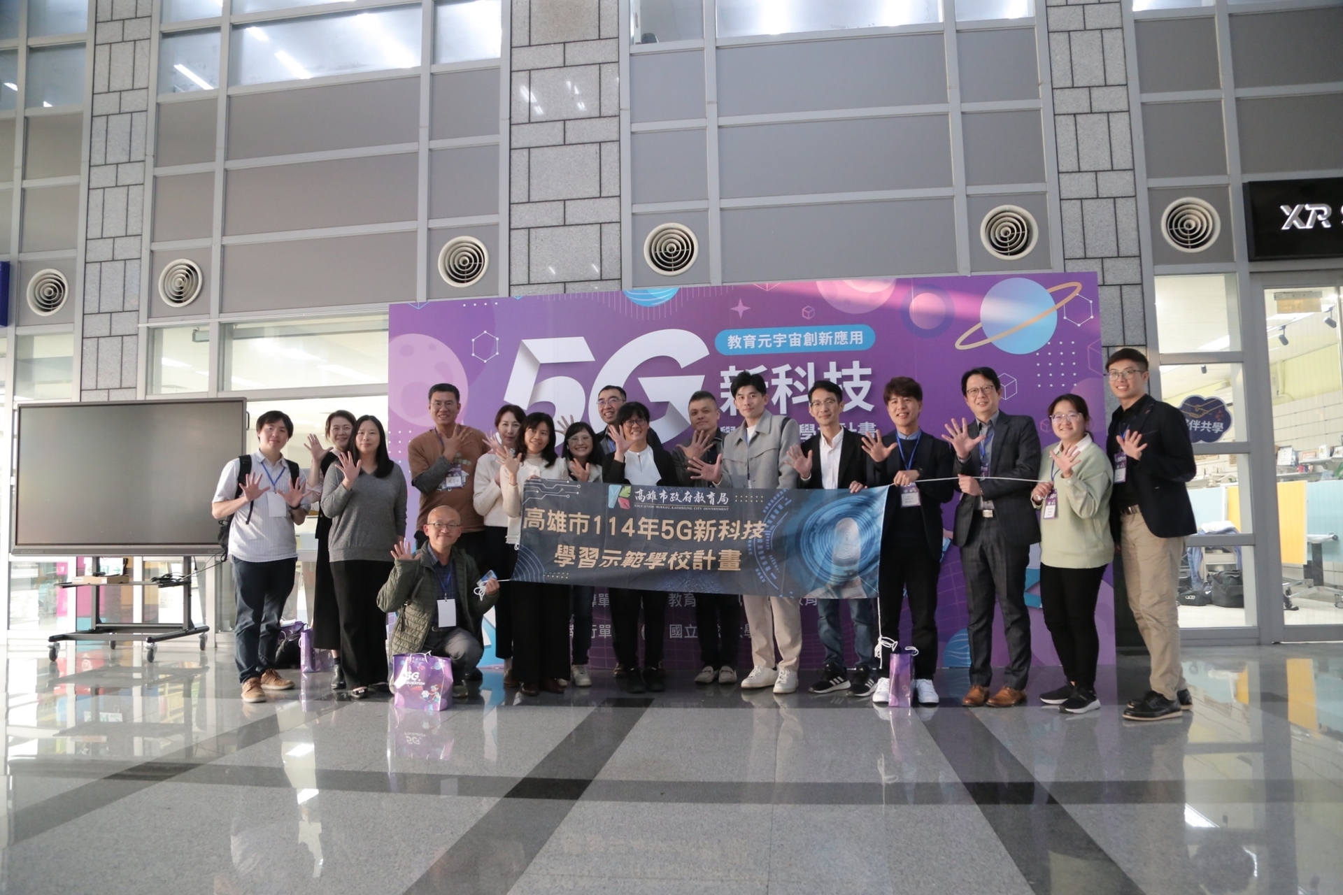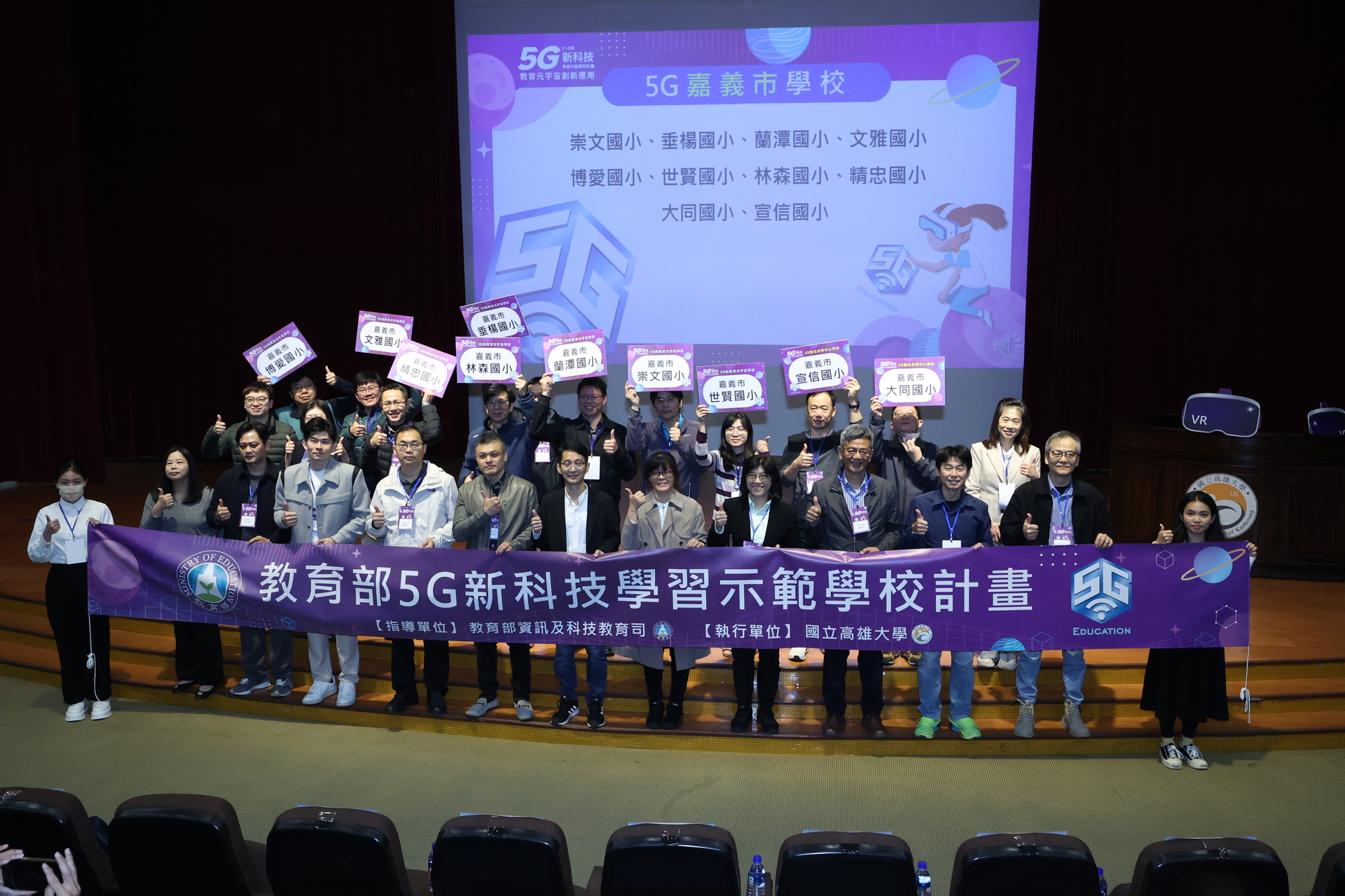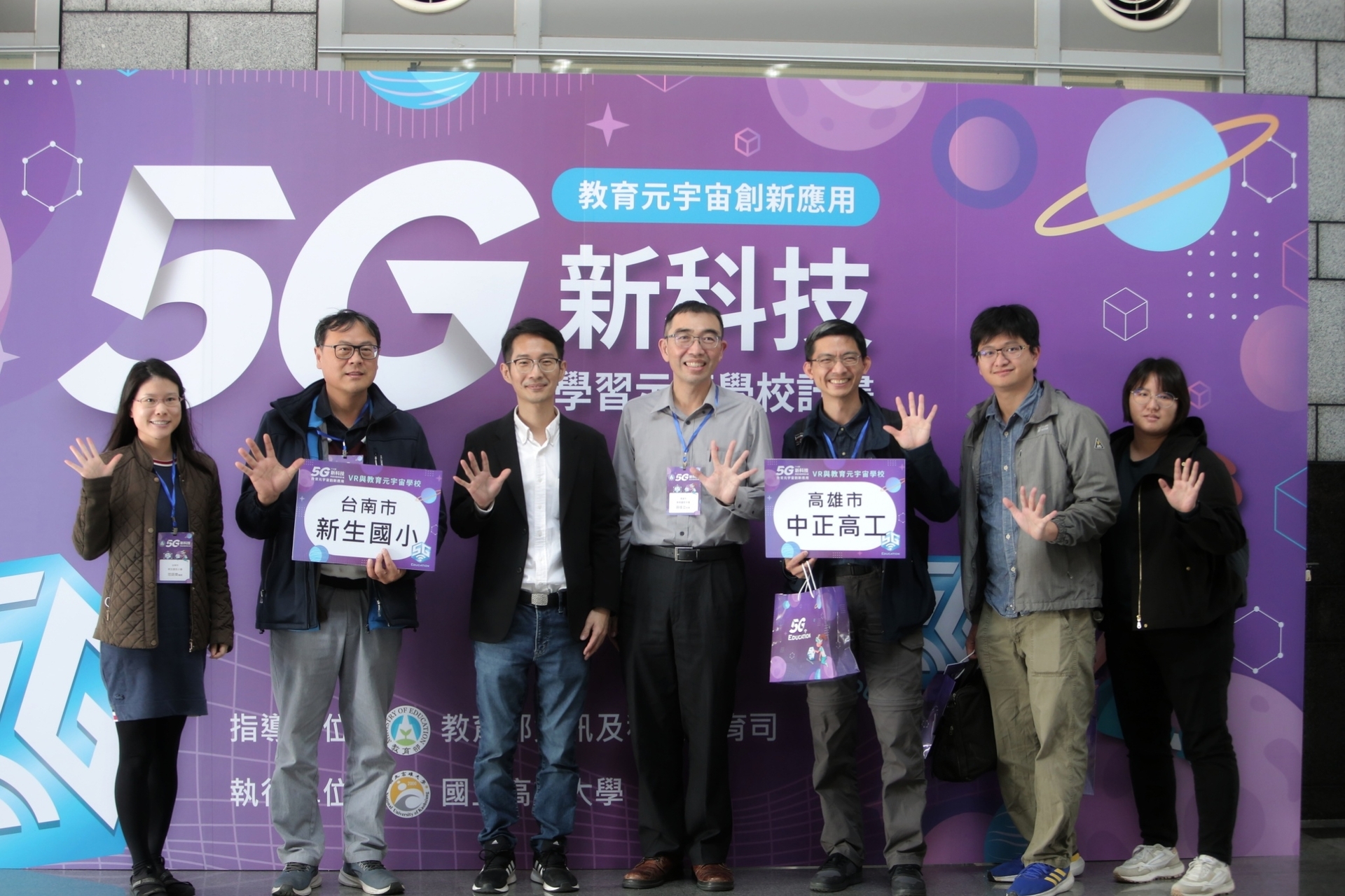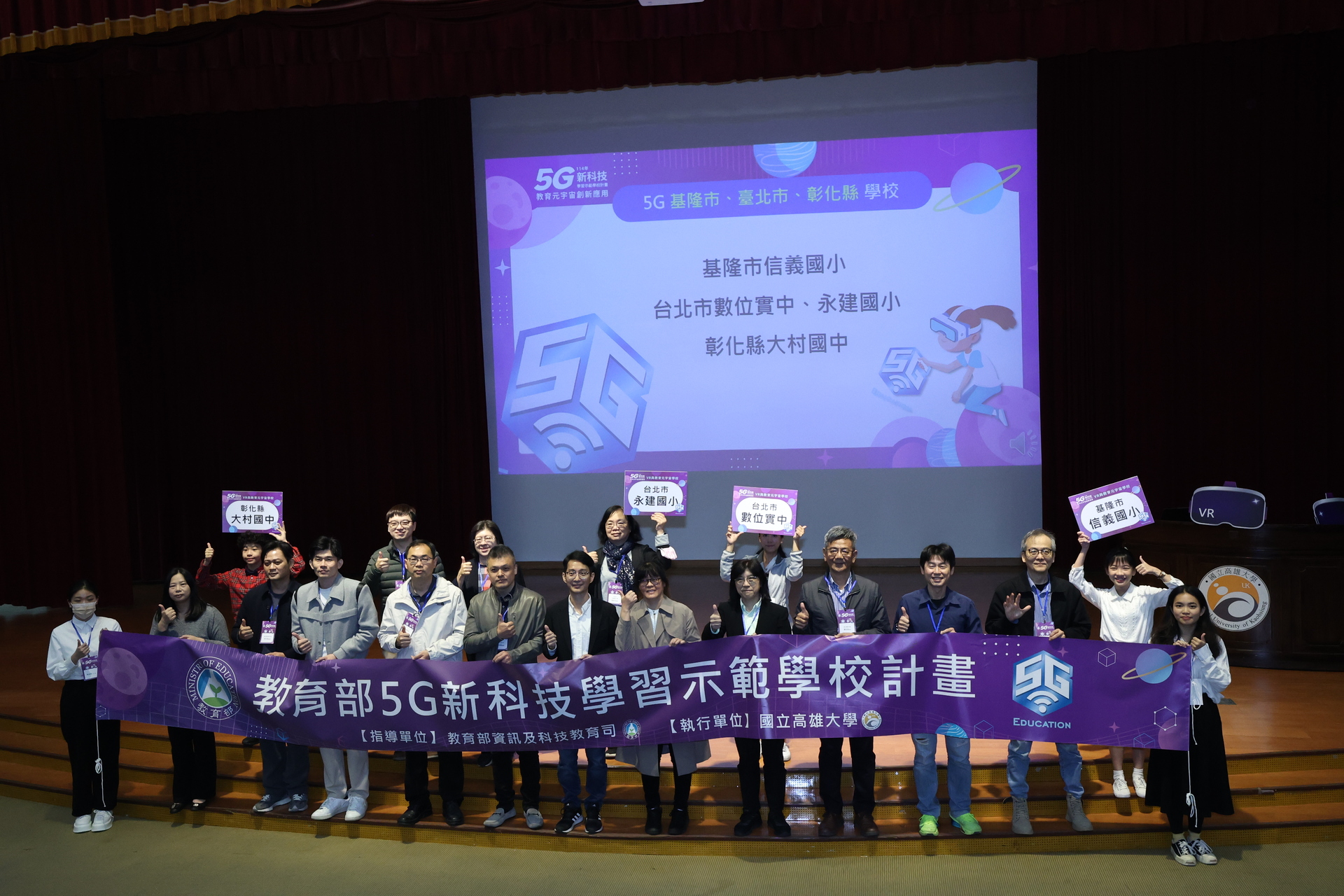 教育部資訊及科技教育司科長鄧慧穎、國立高雄大學學術副校長莊琇惠、主任秘書潘欣泰、教務長張志鴻,以及5G計畫團隊主持人國立清華大學教授吳聲毅、國立高雄大學副教授王政弘、國立台南大學副教授伍柏翰等人,共同以「Give Me Five」手勢啟動5G燈柱,象徵計畫正式展開。