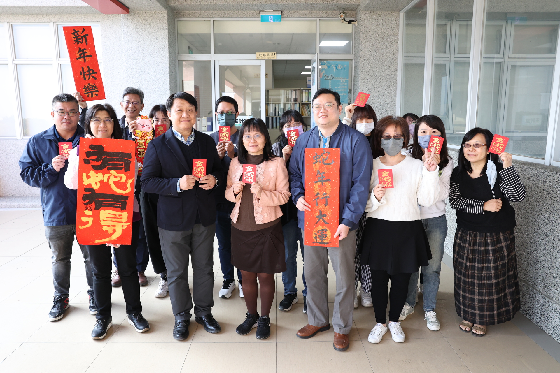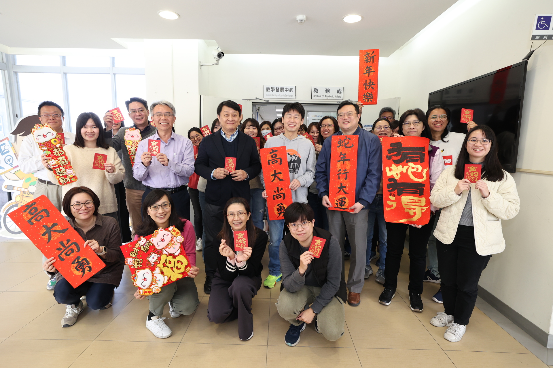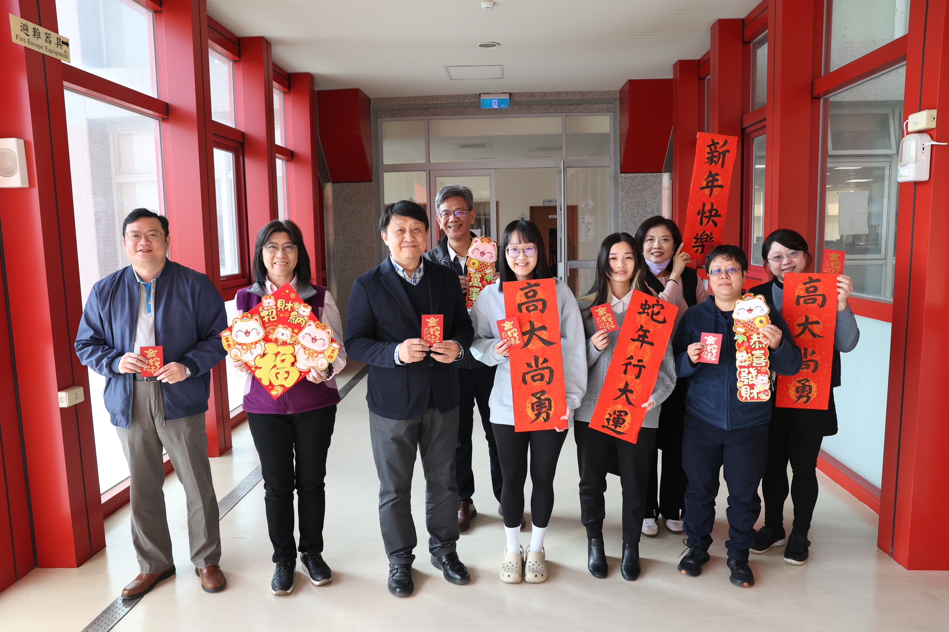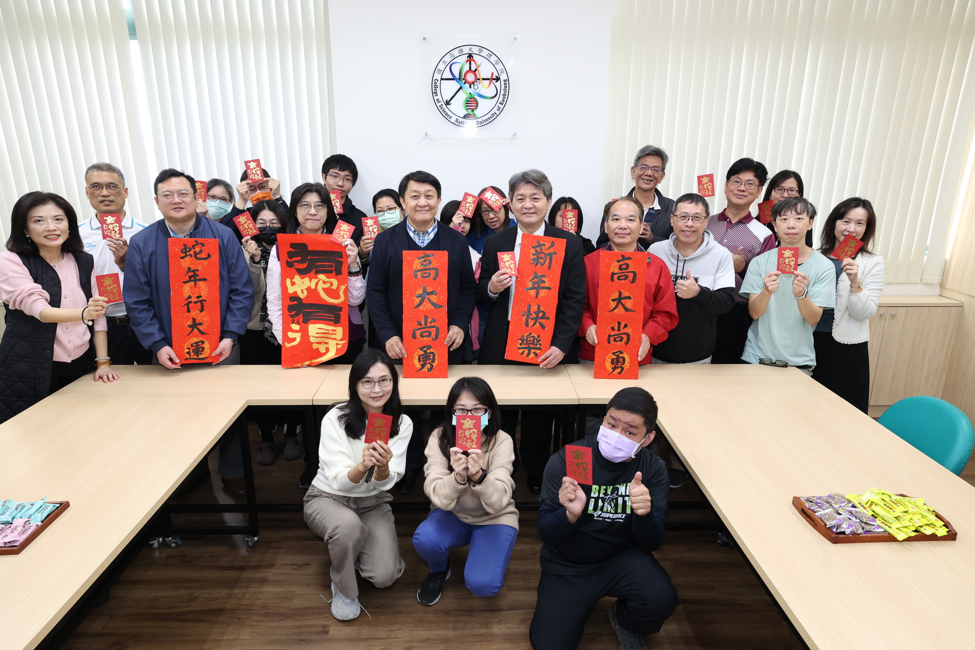 「開工大吉,今年我們繼續攜手打拼!」國立高雄大學今(5)日舉辦新春團拜活動,校長陳啓仁帶領行政團隊至各學院、處室、中心拜年、致贈「金蛇迎春」祝福紅包,感謝師長同仁過去辛勞,同時期勉「蛇騰四海,捨得拼搏」、校務蒸蒸日上。