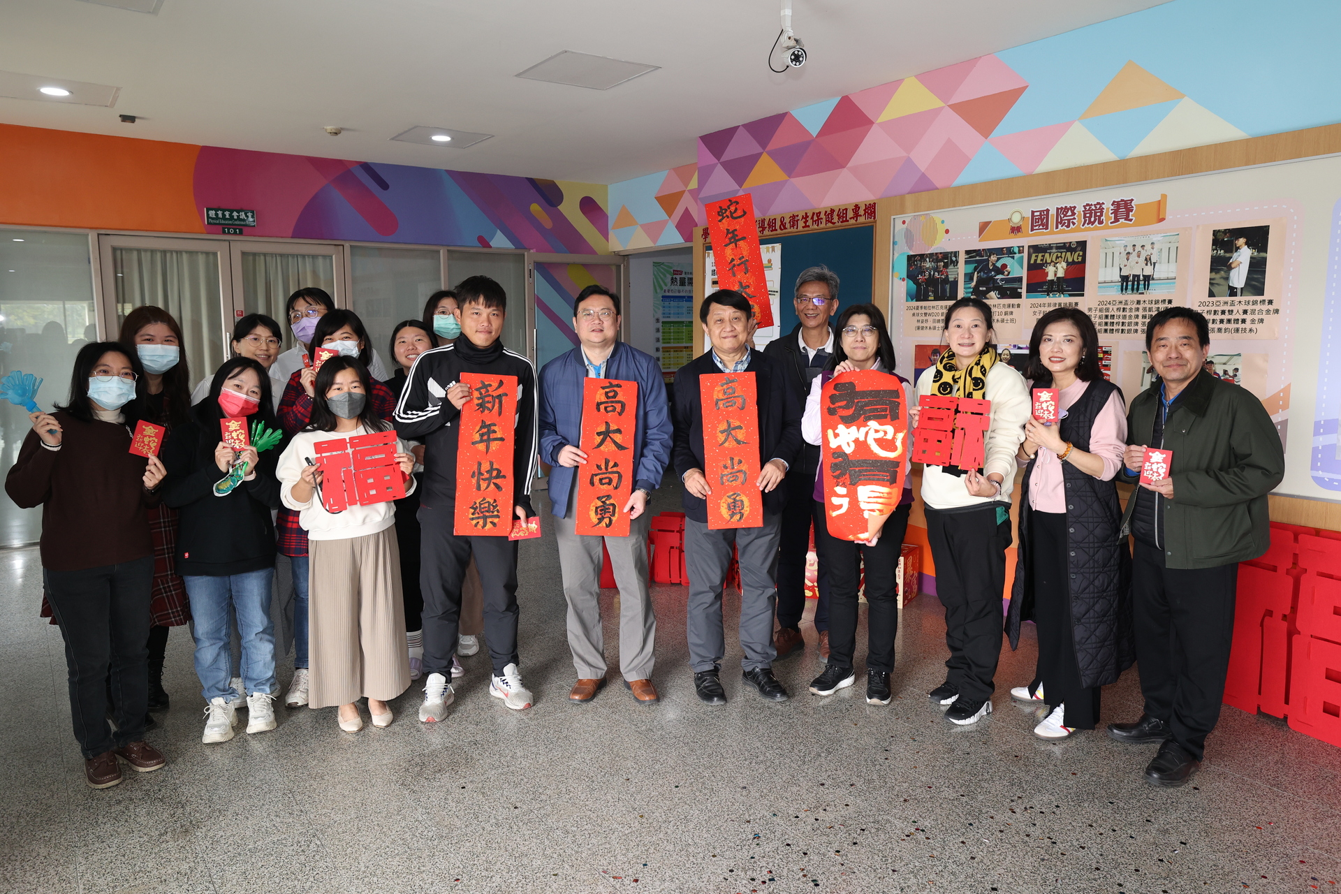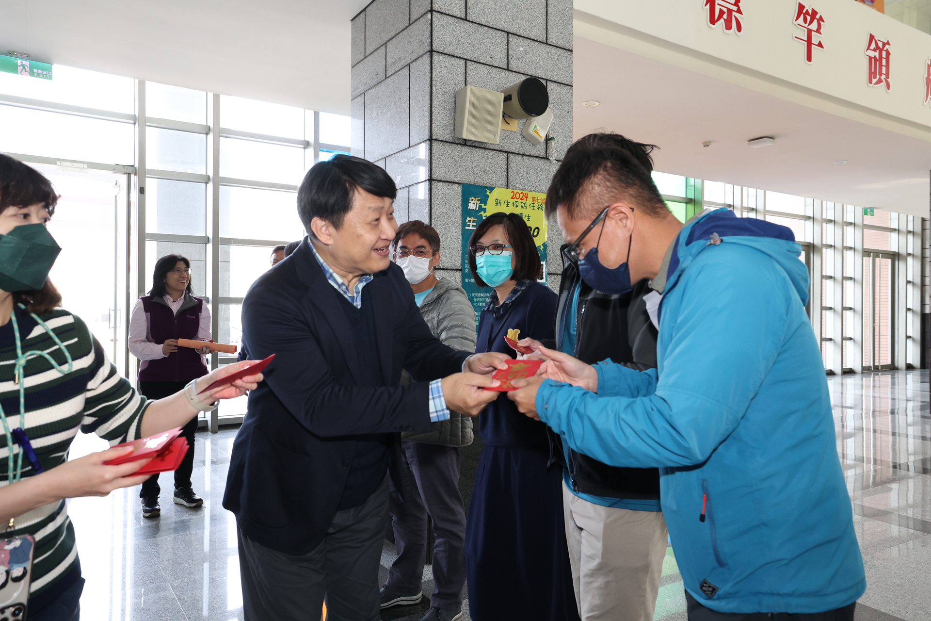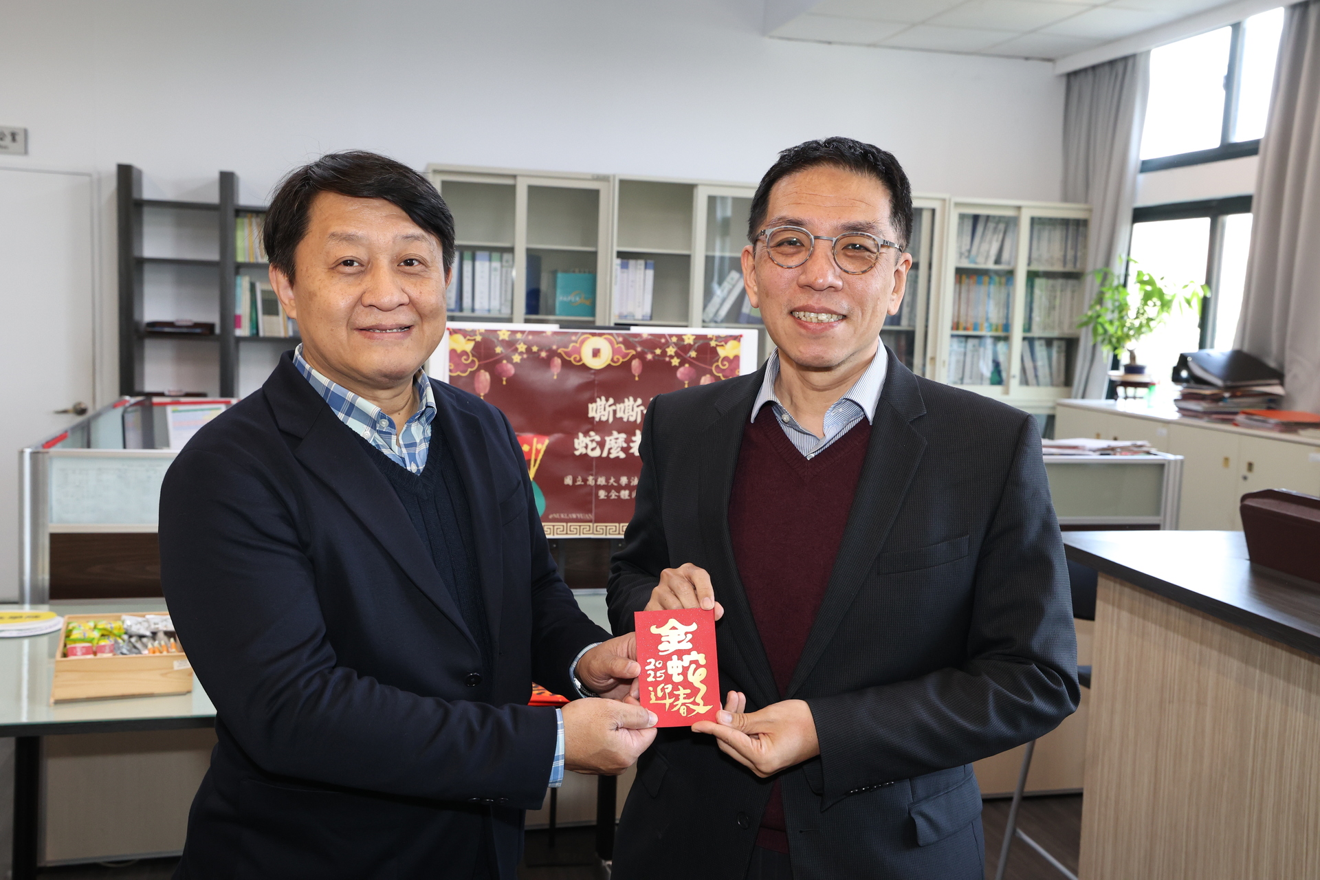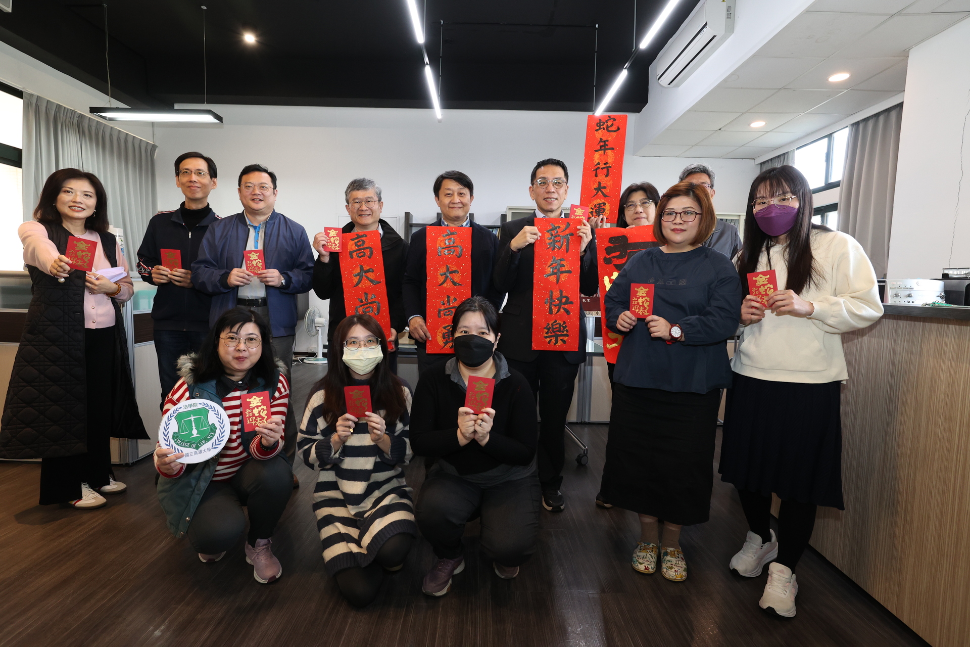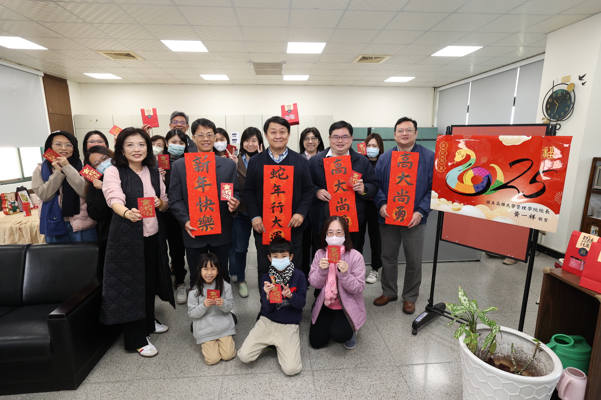 「開工大吉,今年我們繼續攜手打拼!」國立高雄大學今(5)日舉辦新春團拜活動,校長陳啓仁帶領行政團隊至各學院、處室、中心拜年、致贈「金蛇迎春」祝福紅包,感謝師長同仁過去辛勞,同時期勉「蛇騰四海,捨得拼搏」、校務蒸蒸日上。