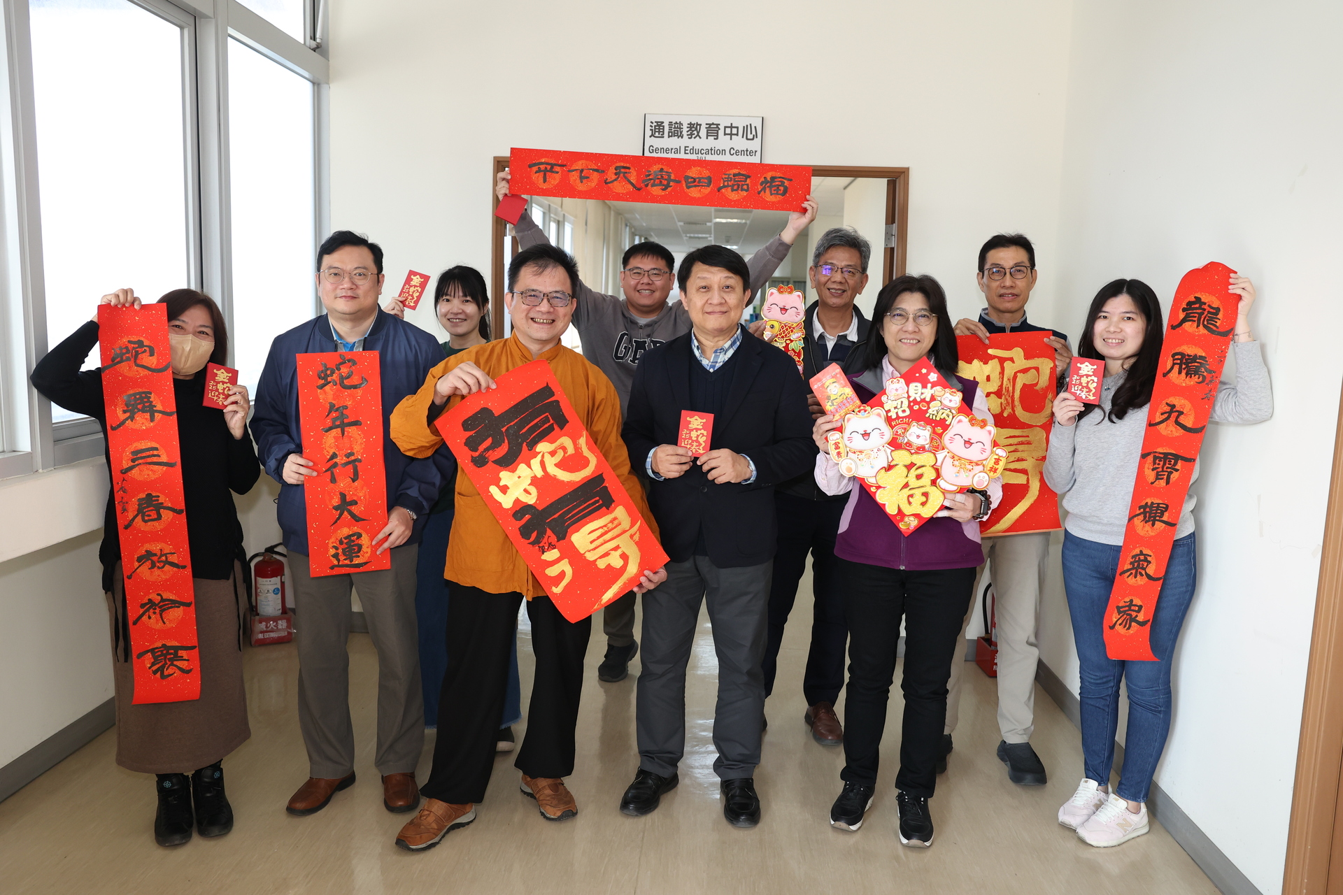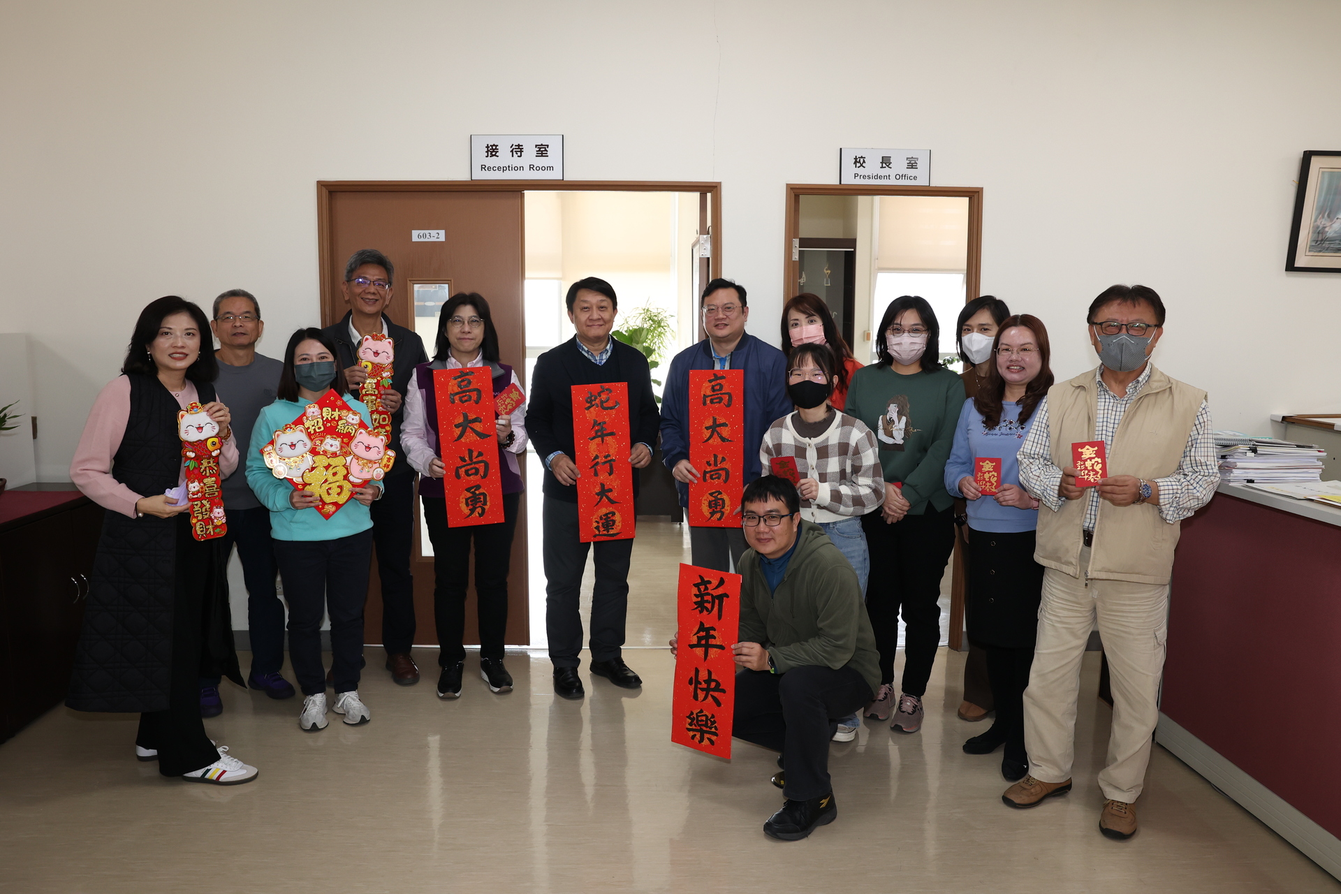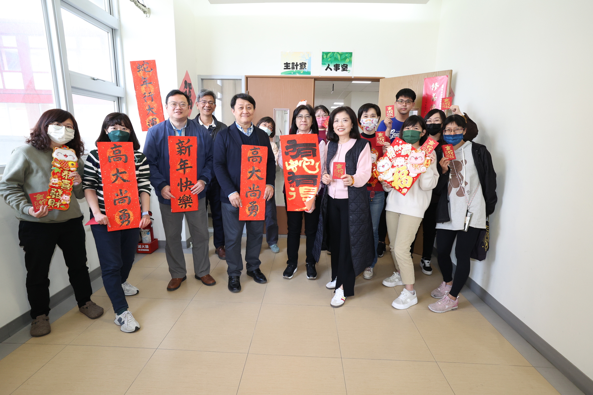 高雄大學校長陳啓仁、學術副校長莊琇惠、行政副校長吳行浩、主任秘書潘欣泰、人事室主任何淑瑜前往校內各單位走春祝賀。