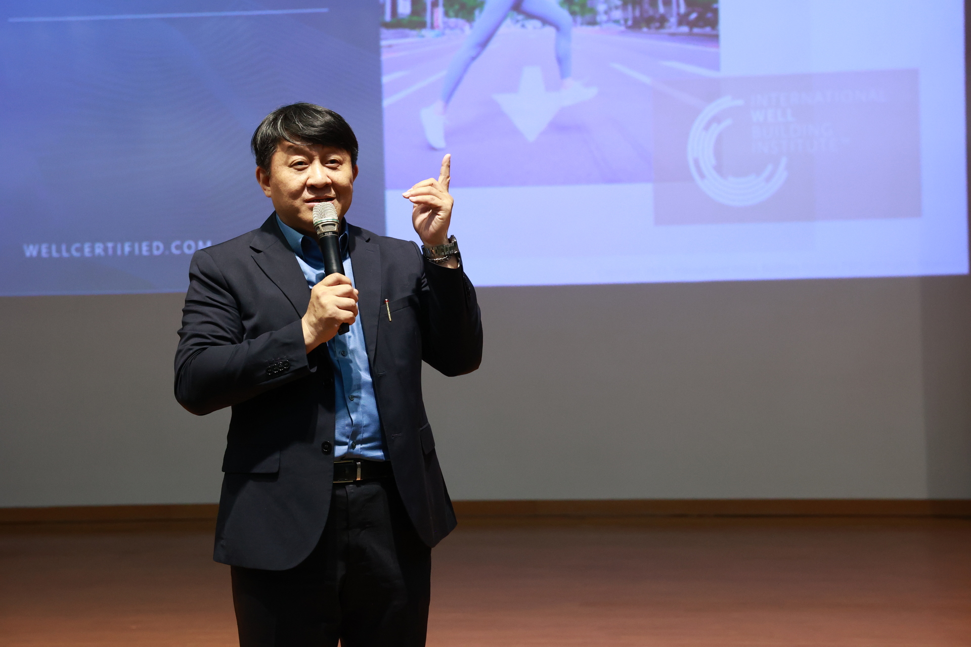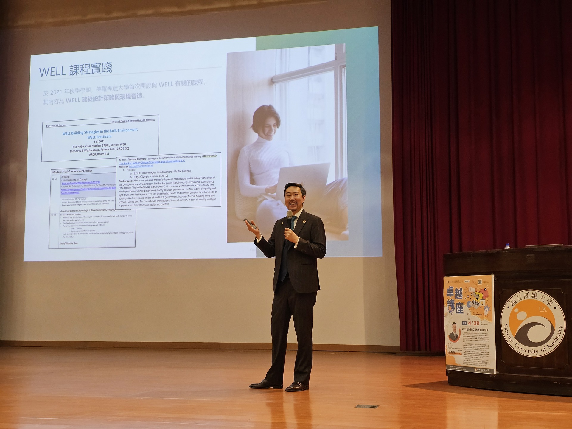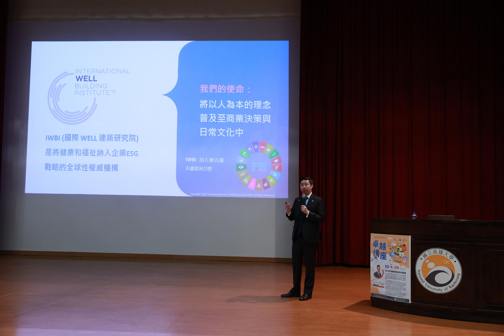 國立高雄大學29日《卓越講座》,邀請國際WELL建築研究院(IWBI™)亞洲區副總裁張為舜,以「WELL助力健康空間和社會永續發展」為題,分享「WELL健康建築標準(WELL Building Standard)」核心理念與全球趨勢,除了剖析健康建築如何成為永續發展的關鍵,也強調其對提升生活品質與企業競爭力的重要性。