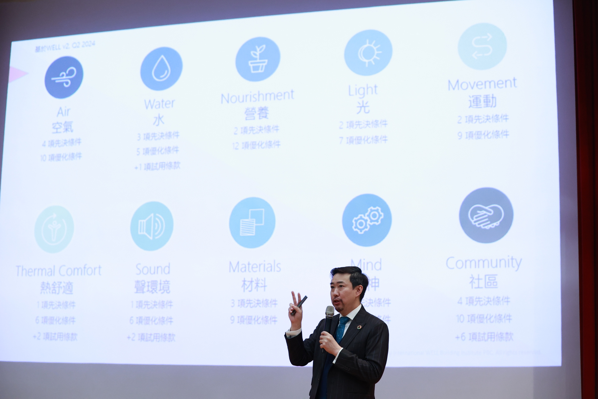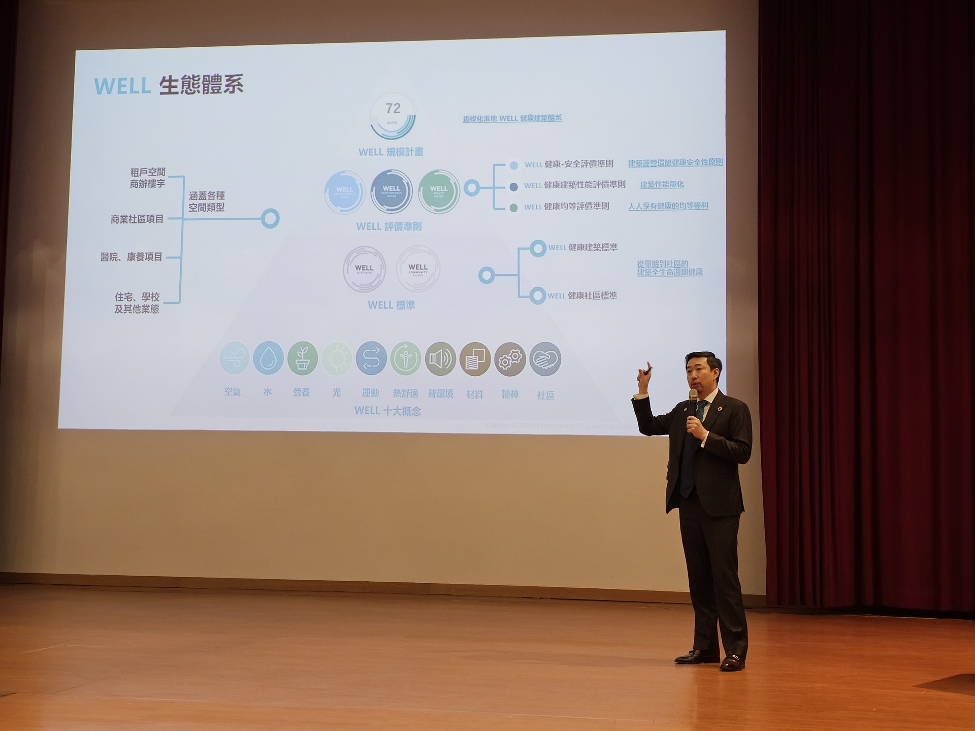 張為舜指出,WELL健康建築標準是全球首個以人類健康與福祉為核心的建築認證,涵蓋空氣、水質、營養、光線、運動、熱舒適、聲環境、材料、精神與社區等10大概念,旨在降低健康風險、提升工作效率與生活品質。隨著全球疫情催化,健康建築需求激增,自2014年推出以來,WELL標準已應用於136個國家,涵蓋逾5萬地點,惠及超過1850萬人。