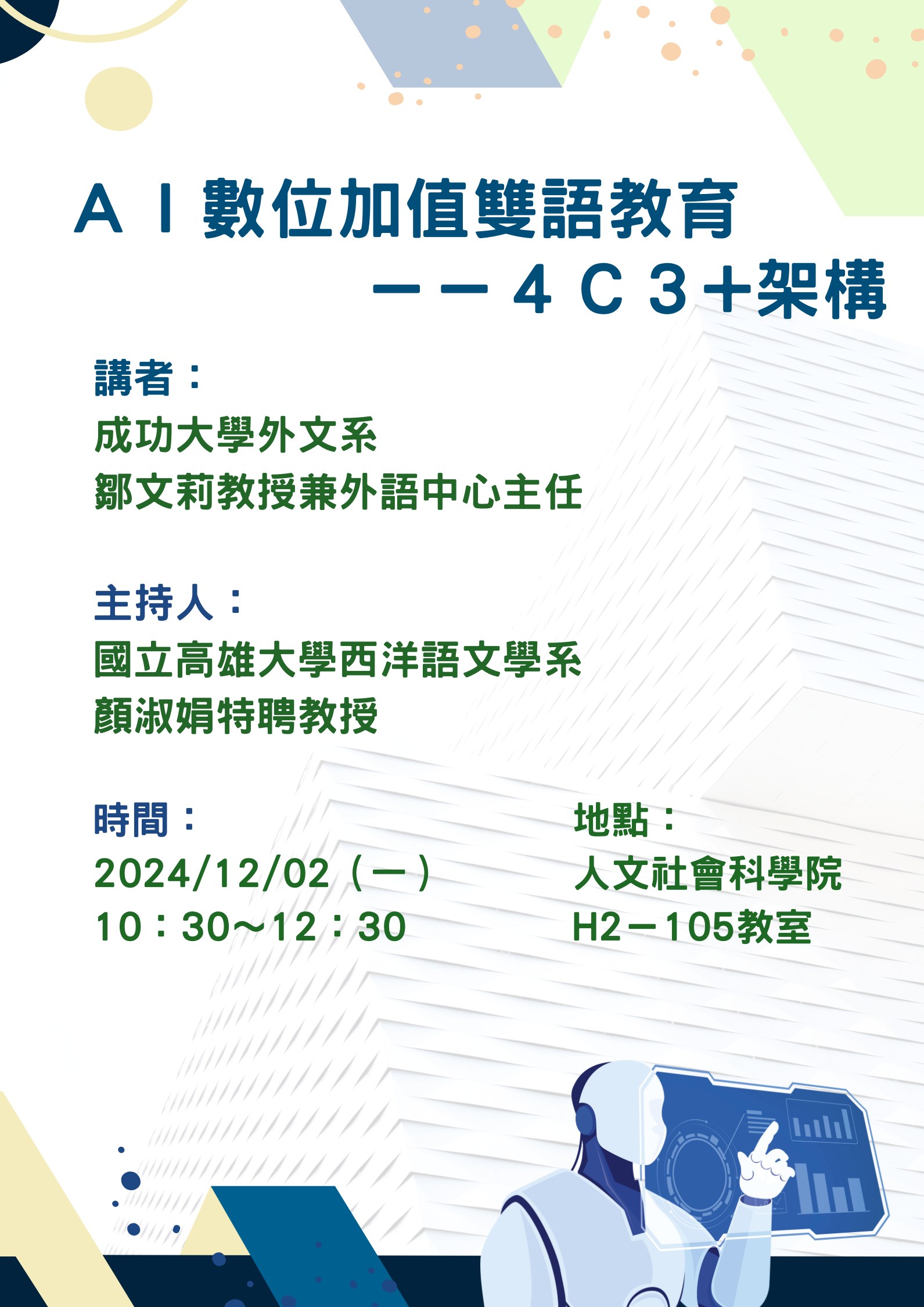 西語系顏淑娟老師邀請成功大學外文系鄒文莉教授兼外語中心主任演講。講題:「AI數位加值雙語教育--4C3+架構」