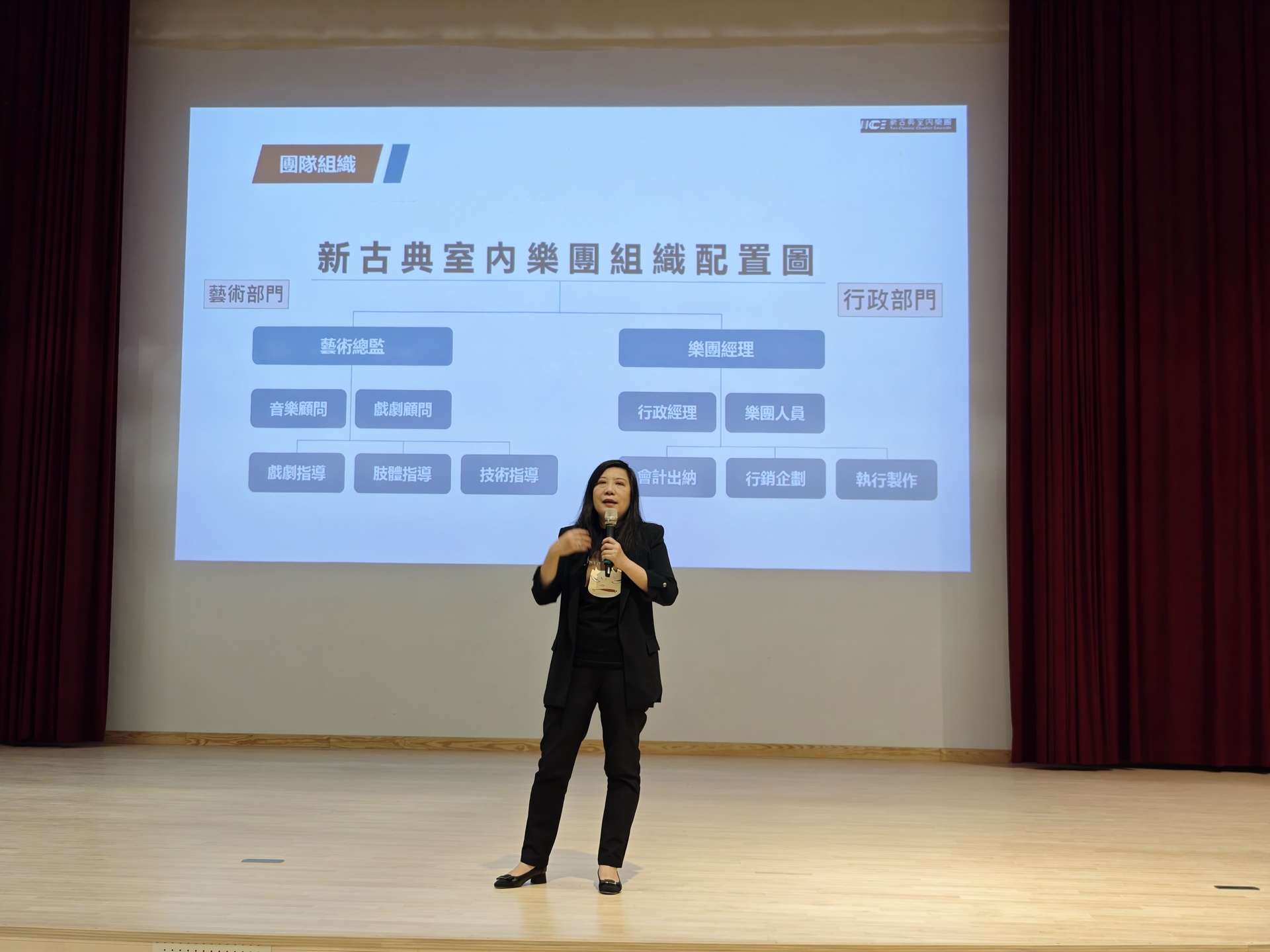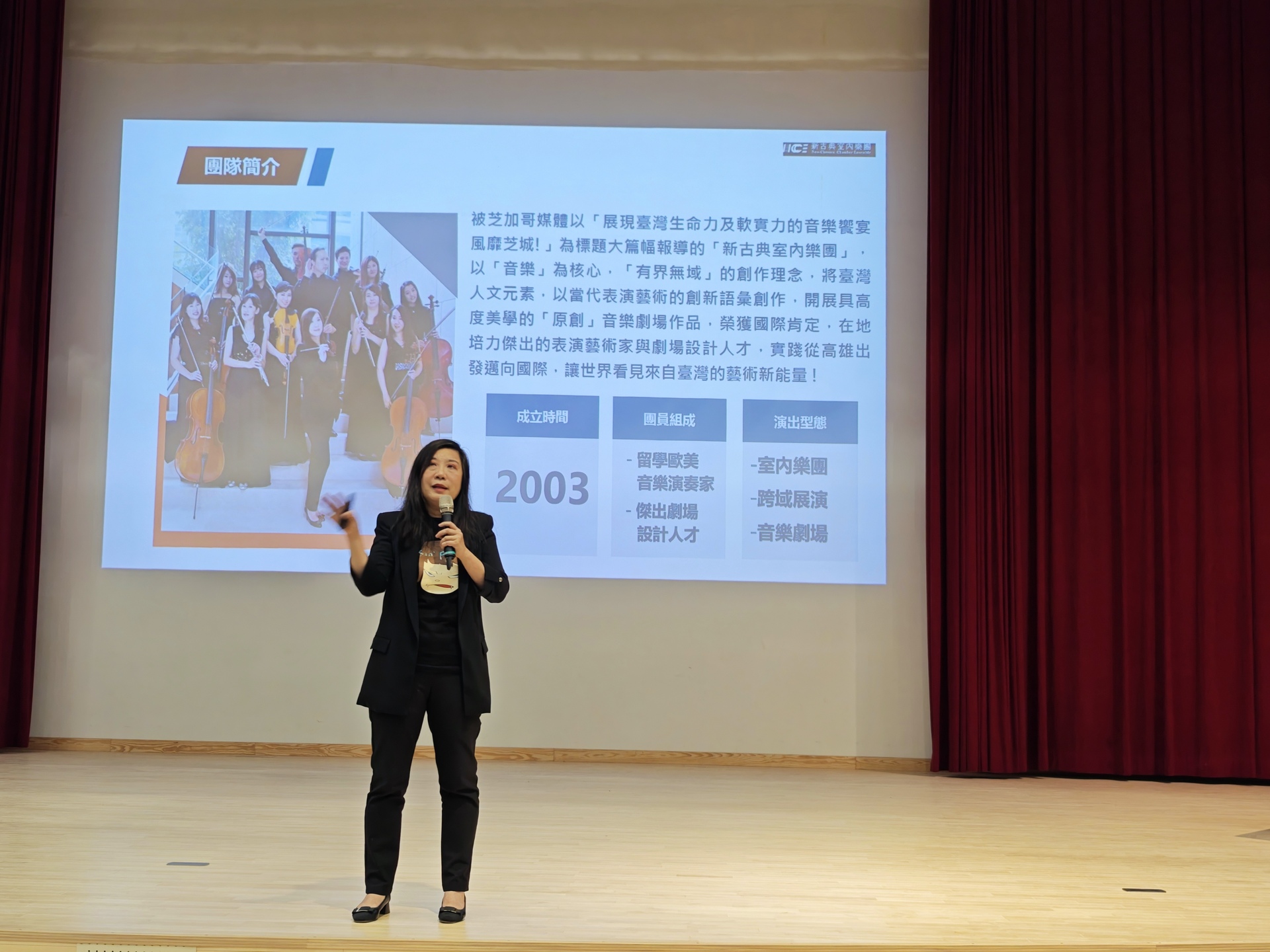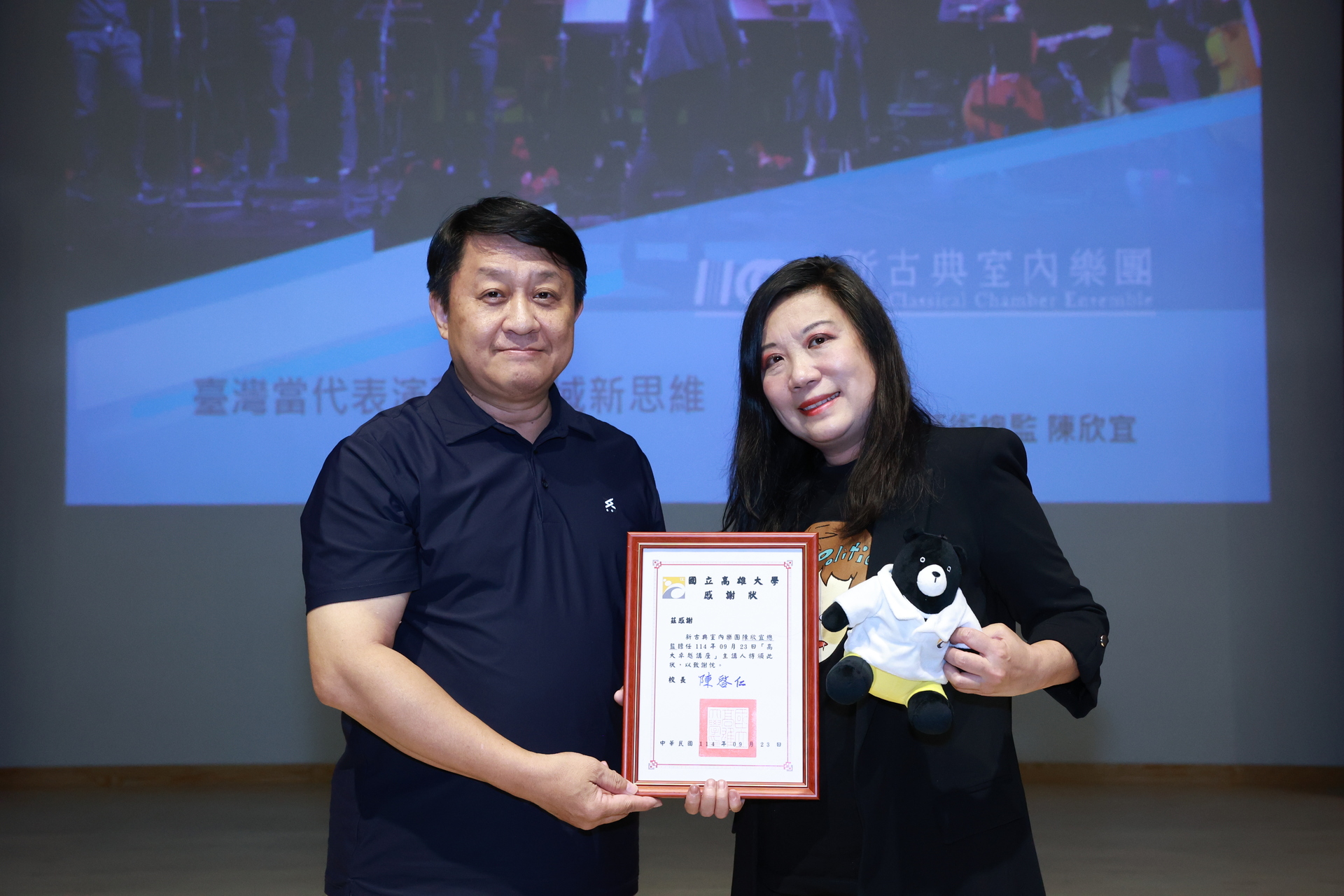 最後,她勉勵學生,無論未來走向何種專業,都應勇於嘗試與堅持,並在跨域合作中主動交流,激盪創意,找到屬於自己的獨特定位。她強調,新古典室內樂團不只是演出團體,而是一個以臺灣為根基、從高雄出發邁向國際的創作品牌,期望讓更多人透過表演藝術看見臺灣的文化底蘊。