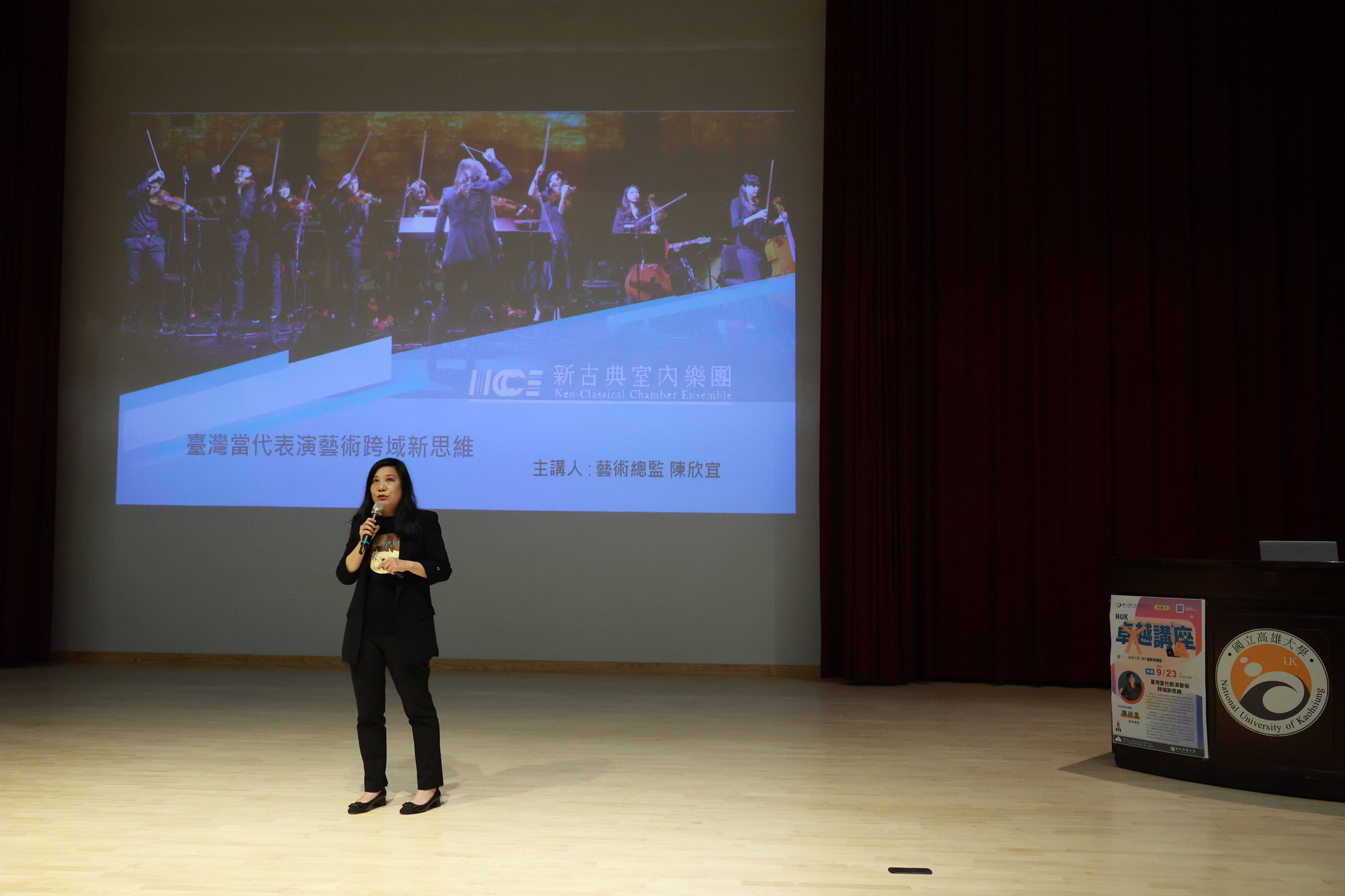 國立高雄大學23日舉辦本學期首場《卓越講座》,邀請新古典室內樂團藝術總監陳欣宜,以「臺灣當代表演藝術跨域新思維」為題,與學生分享其跨域創作歷程與理念。講座中,她以音樂、人文與科技交織的實例,帶領學生思考如何從臺灣出發,走向國際舞台。