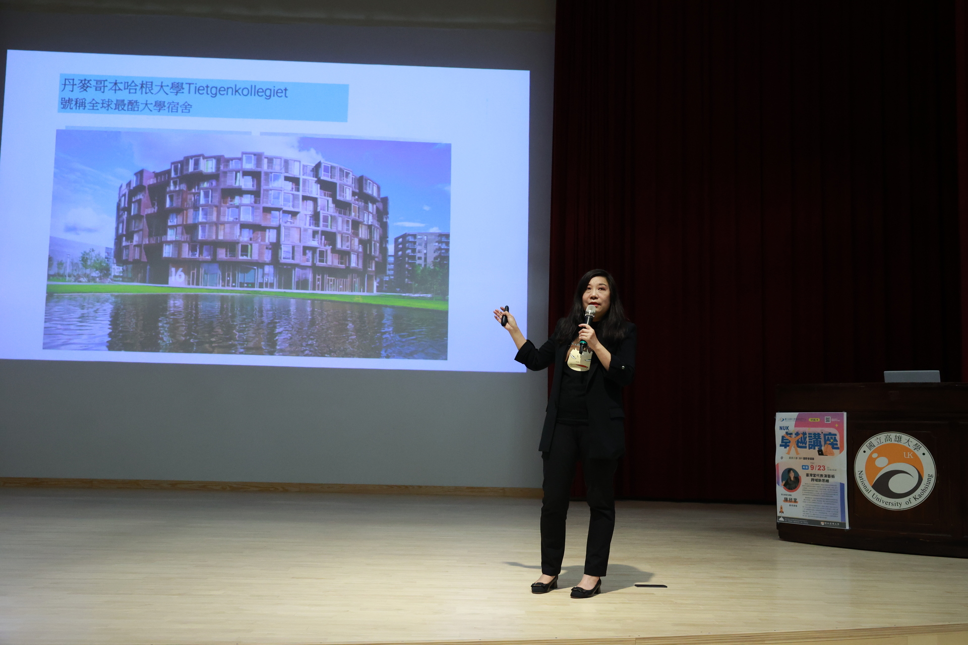 演講中,她以北歐藝術學校及國際大學宿舍的建築案例為例,說明「溝通、互動、協同」的設計精神如何促進交流與共鳴。她引導學生將建築比擬為書架、蜂巢或客家土樓,帶領大家思考空間與人際互動的關係,並指出「在場域中創造交流機會,就可能激盪出新的合作與想像」,強調跨域思維的起點往往來自日常觀察。