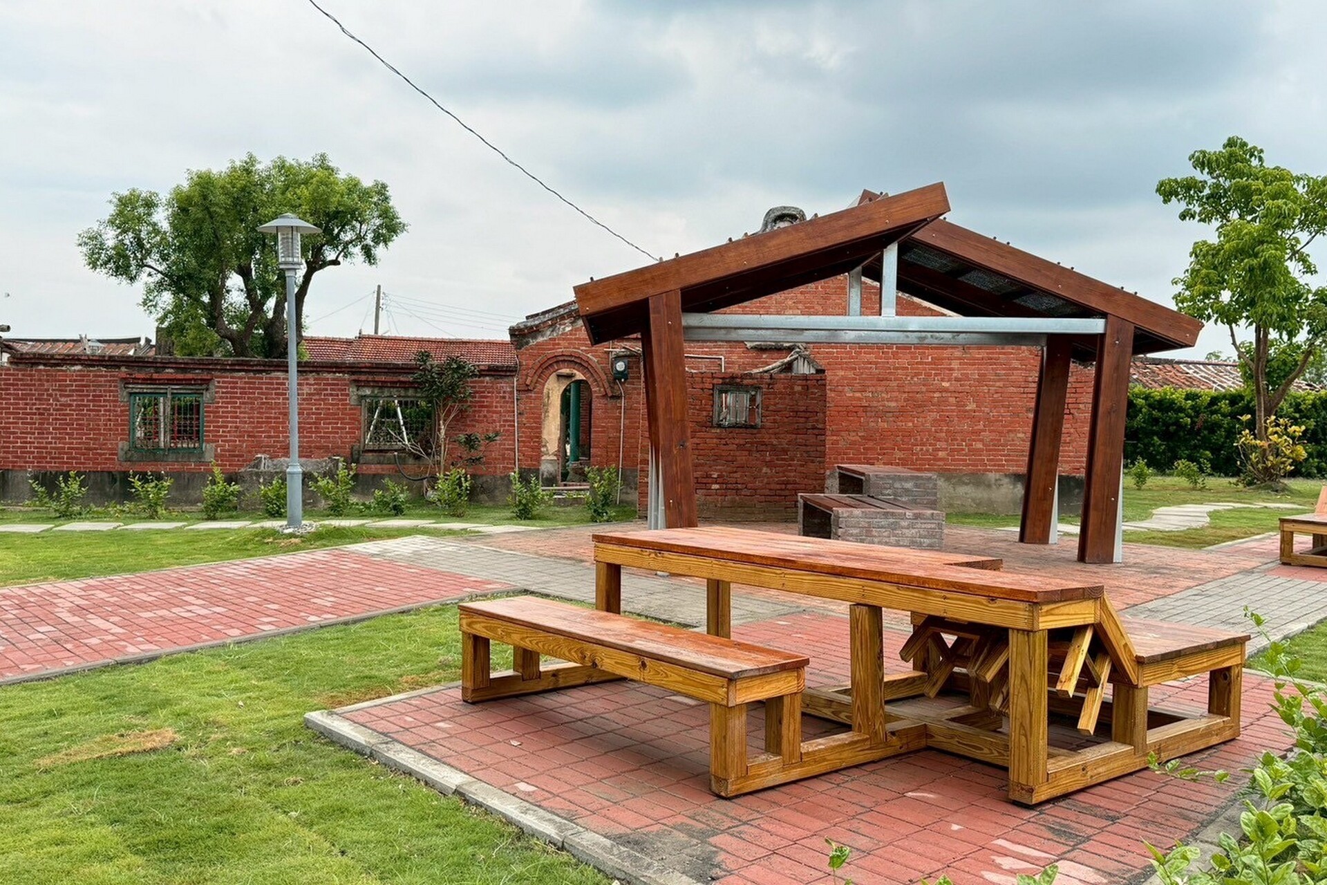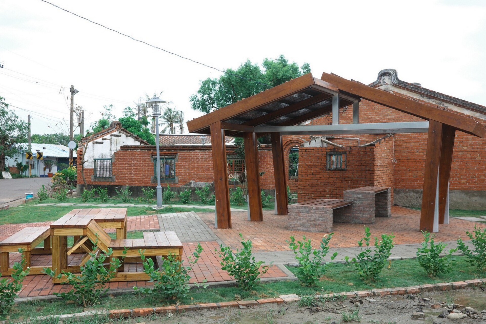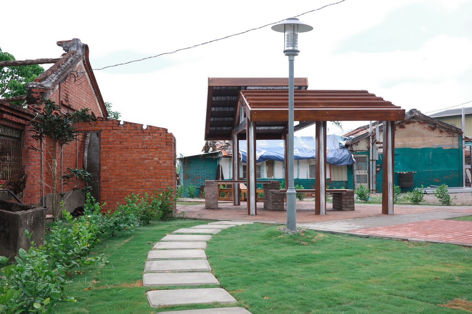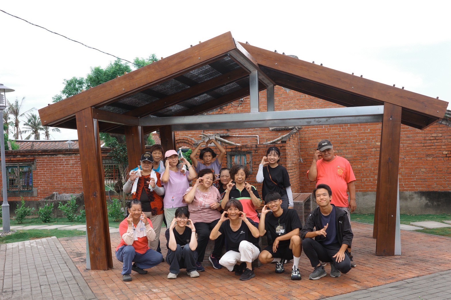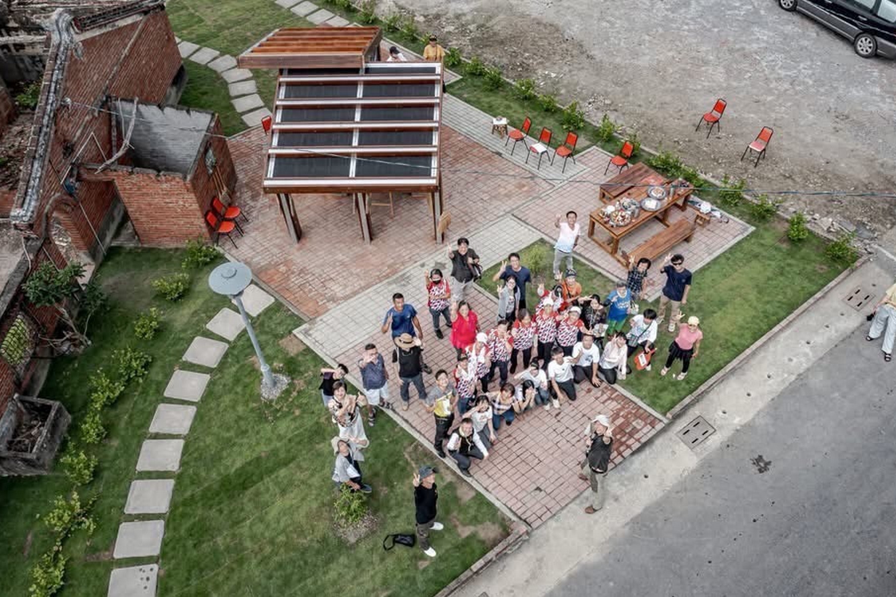 《鳳凰花開的入口(聚陌之隅)》以姑爺社區一處老宅後院為基地,拆除原有封閉圍牆,轉化為共享的社區生活庭園。設計採用木構造與C型鋼結合,提升結構安全性;庭院鋪面則運用清水磚、透水磚與水泥板,形塑多樣化的空間層次。針對長者需求,規劃無障礙動線與加高座椅,兼顧人性化與永續使用。作品不僅是一處公共空間,更成為凝聚社區情感的新據點。