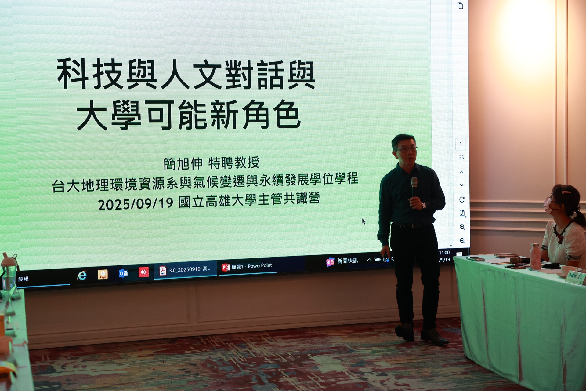 本次共識營亦邀請台灣大學地理環境資源系與氣候變遷與永續發展學位學程特聘教授簡旭伸,以《科技與人文對話與大學可能新角色》為題演講。他指出,人工智慧、大數據與氣候變遷等挑戰正迫使大學重新定位,傳統分科已難以回應社會需求。大學必須跨領域合作,促進人文與科技對話,以回應能源轉型、AI倫理與教育公平等議題。