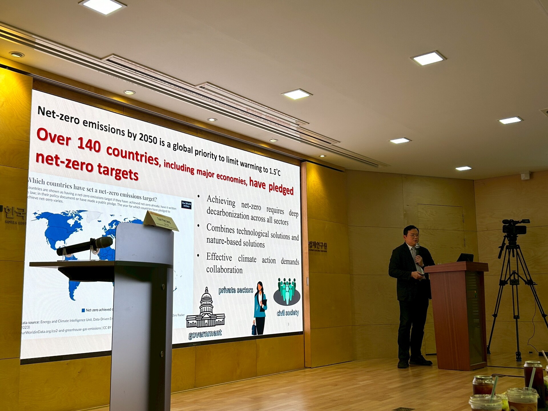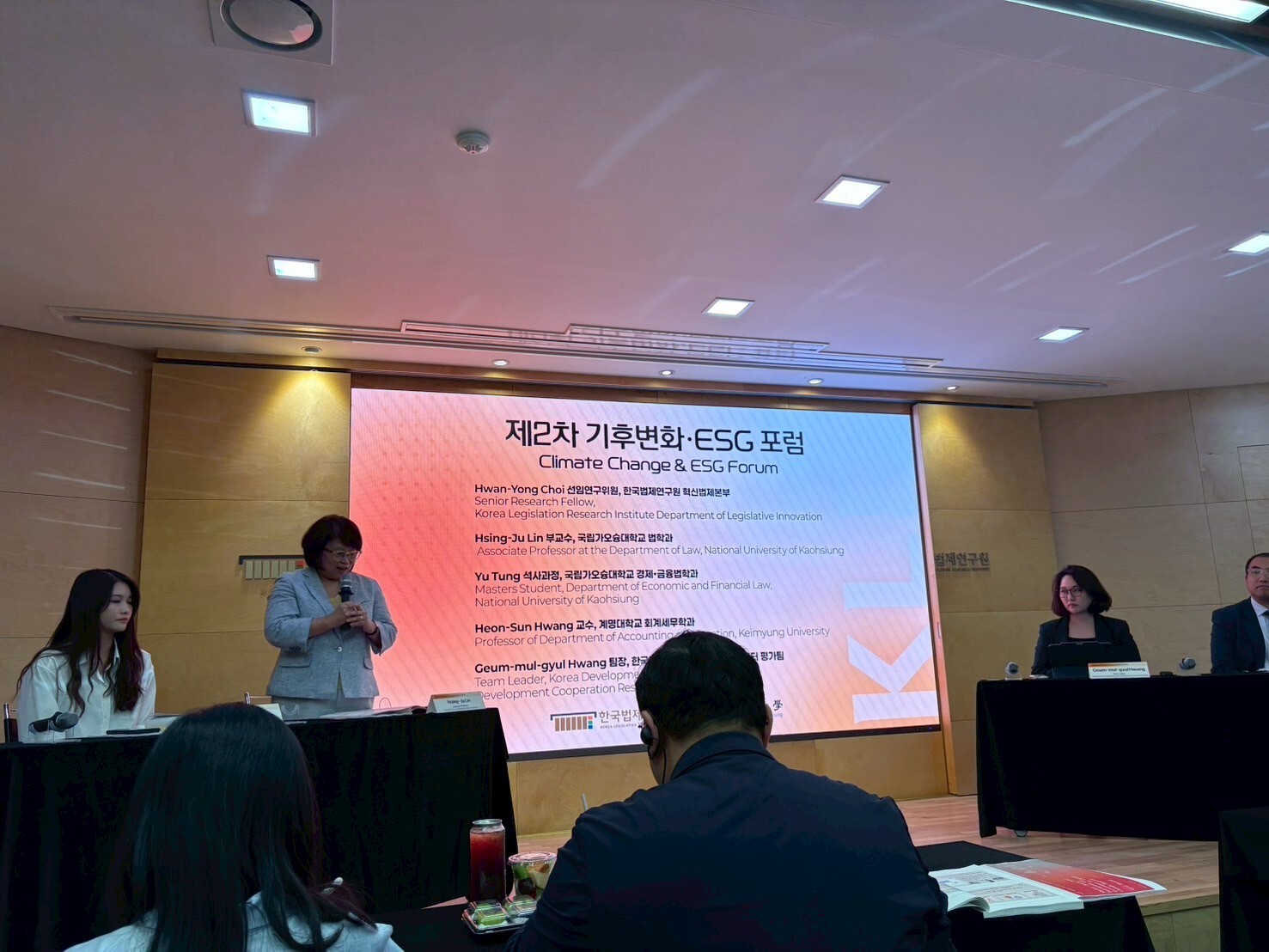 隨後前往世宗市韓國法制研究院,結合高教深耕計畫的移動課程,雙方合辦「氣候變遷與智慧城市論壇」。吳副校長以 “Advancing Public-Private Partnerships for Nature-Based Solutions to Climate Change – Lessons from Taiwan and the EU’s Experience” 為題發表專題報告,分享臺灣及歐盟以公私協力模式推動自然解方應對氣候變遷的經驗,獲得與會專家學者熱烈迴響;而國際長林倖如則擔任主要與談人,進一步深化論壇的對話與交流。本校兩位財經法律學系研究生也隨團參與,於論壇中進行淨零排放法政策專題報告並加入與談,讓學生能在跨國學習場域中拓展國際視野與專業知能。
