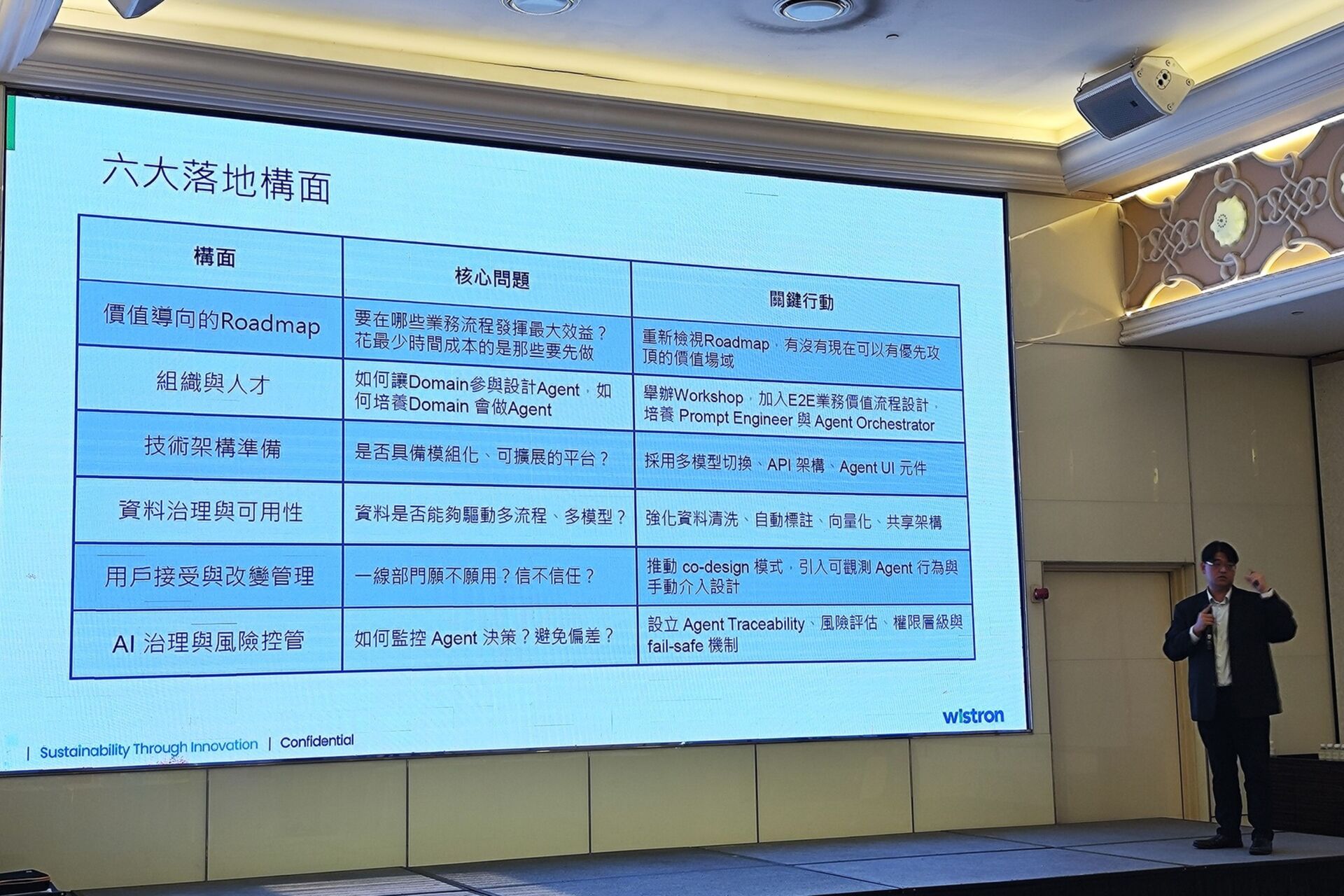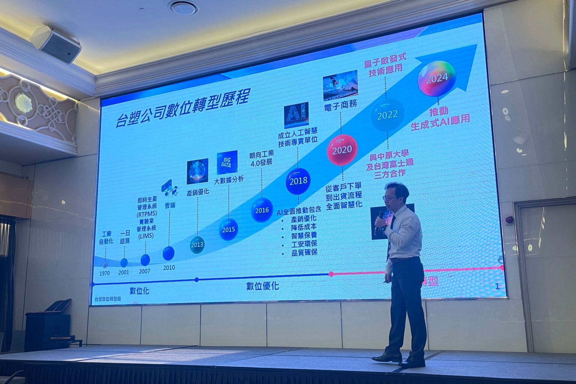 針對「AI 如何實際改變百姓生活?」的提問,台灣塑膠協理 蘇育寬 表示,AI 已帶動台灣經濟成長與國際重視,百姓除了能在投資活動中受惠,也能在醫療用藥進步中看到具體成果。在談及企業數位轉型挑戰時,蘇協理分享台塑的作法:「台塑向來以規章制度管理而壯大,數位轉型同樣從修訂規章制度開始,再由各部門提出改善計畫,雖然進程緩慢,但確實能逐步產生成效。」他笑言,「台塑的蘿蔔與棒子並用,但棒子比較大。」引起現場熱烈回應。