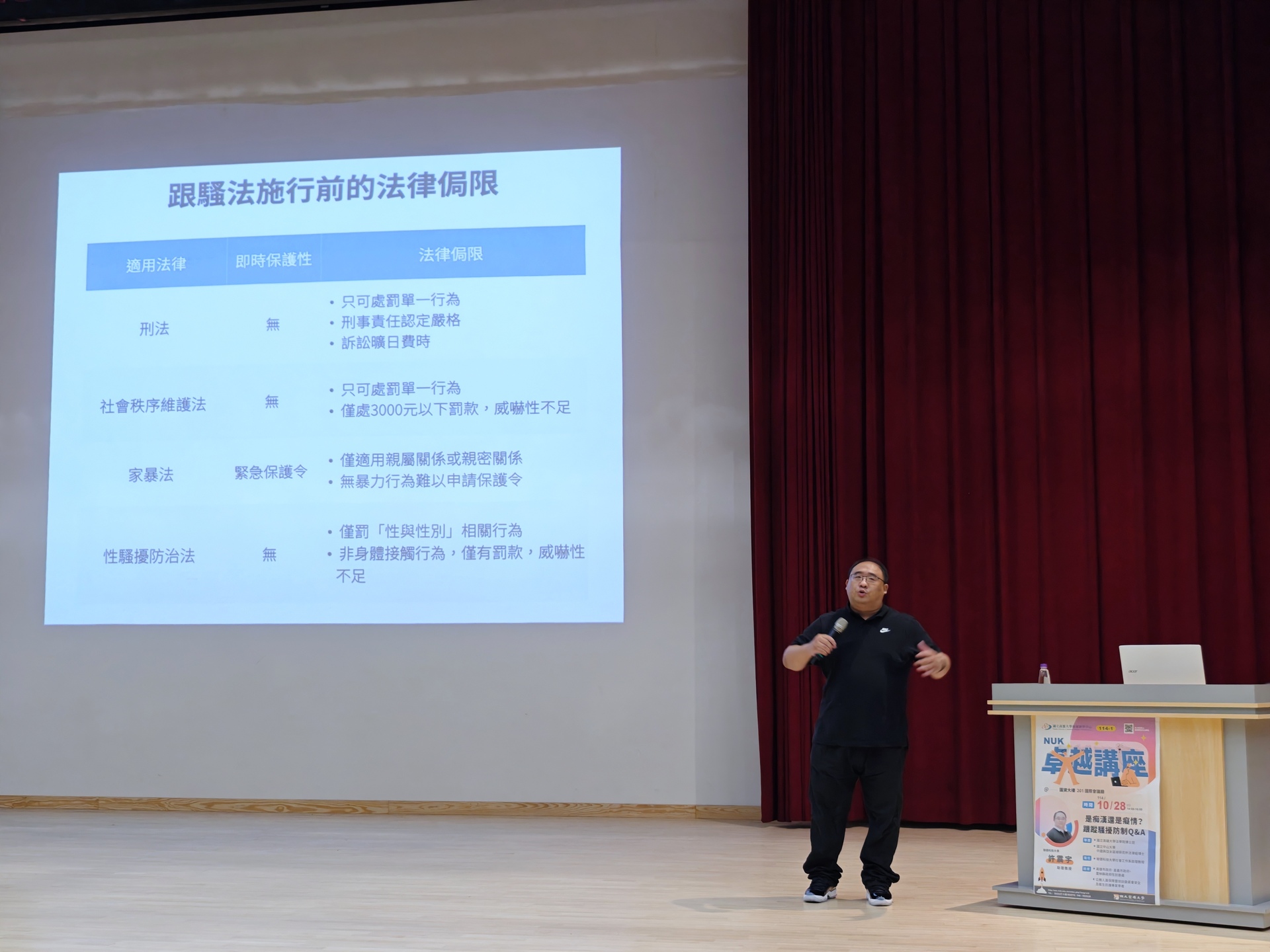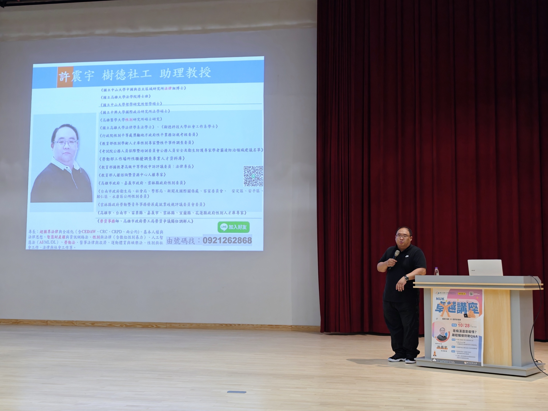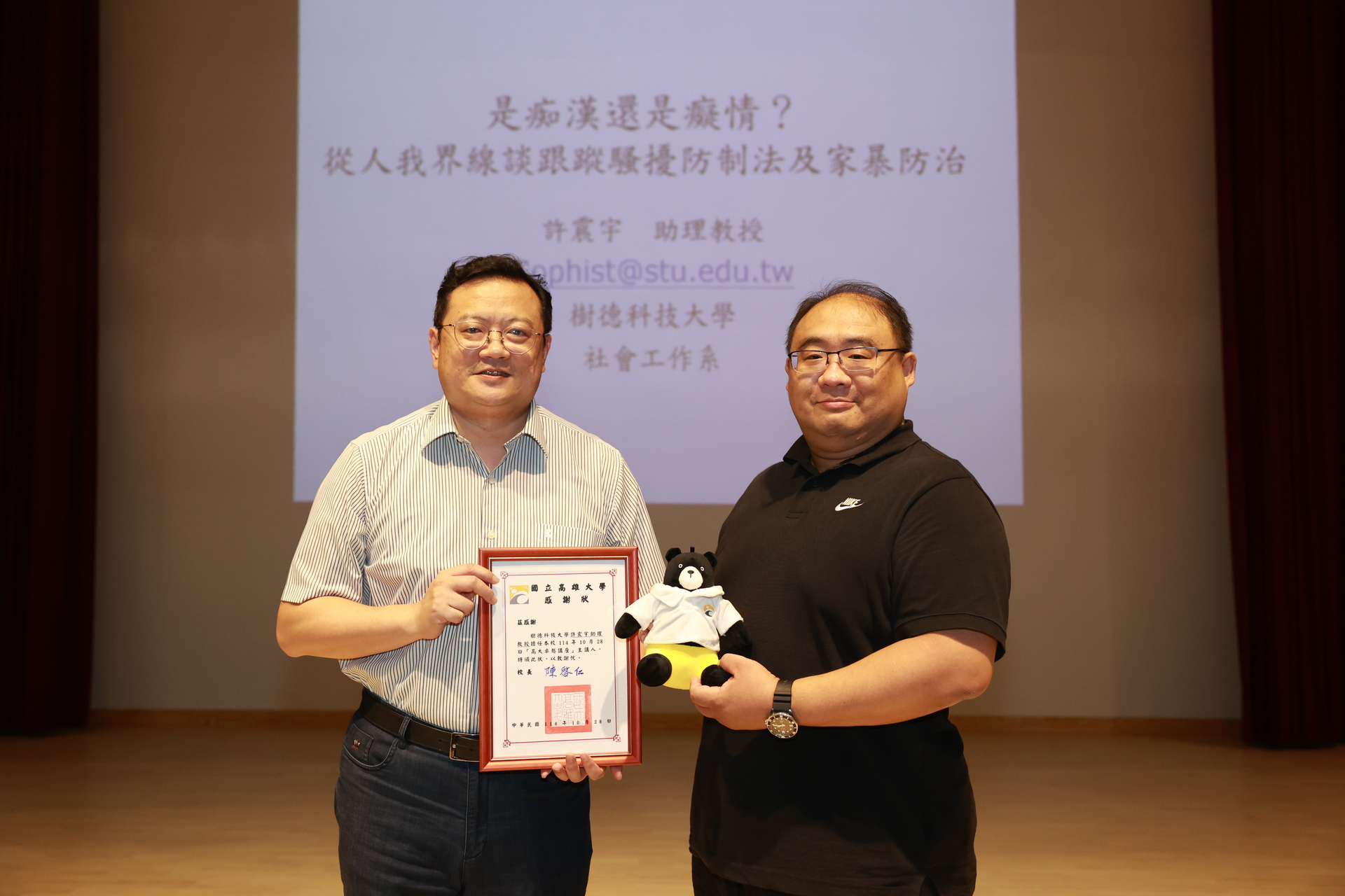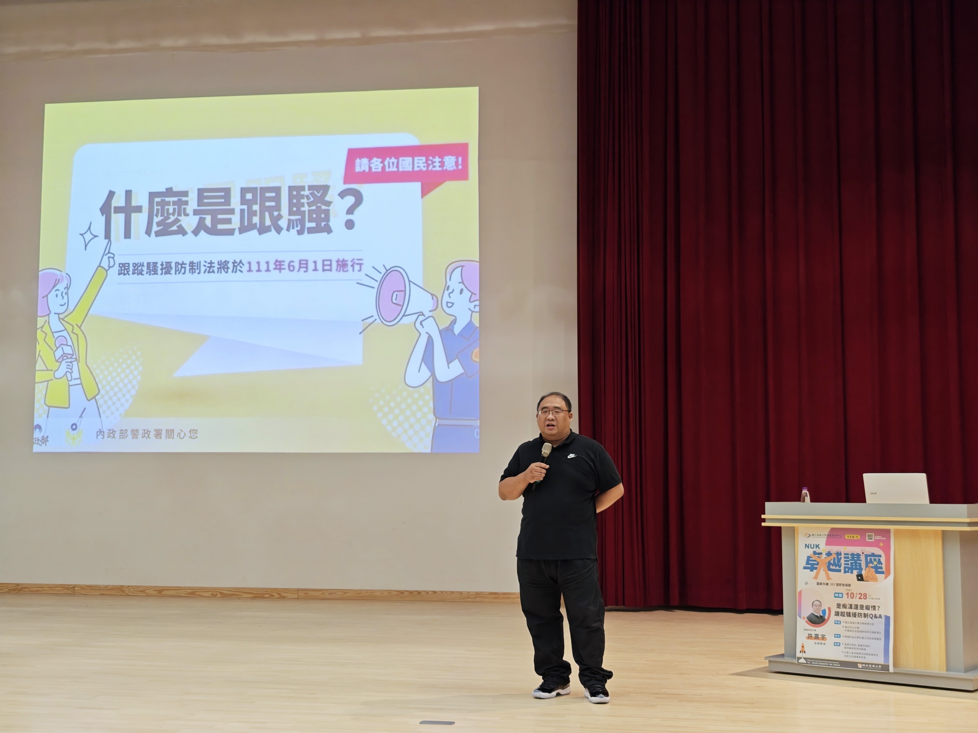 國立高雄大學推廣教育中心舉辦《卓越講座》,28日邀請樹德科技大學助理教授許震宇,以「是痴漢還是癡情?──從人我界線談跟蹤騷擾防制法及家暴防治」為題,透過實例與法條解析,說明《跟蹤騷擾防制法》的立法背景與社會意涵,並延伸探討家庭暴力防治的關聯議題,提醒師生在情感互動與人際往來中,應尊重他人意願、守護自身安全。