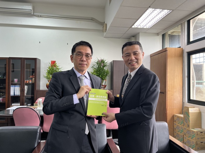 本次拜訪尾聲,陳檢察長贈送最高軍事法院檢察署紀念品。吳院長也致贈法學院專屬紀念品,及比較刑法研究中心出版的「犯罪、資恐與洗錢:如何有效追訴犯罪」一書交流。