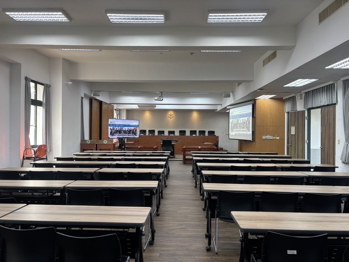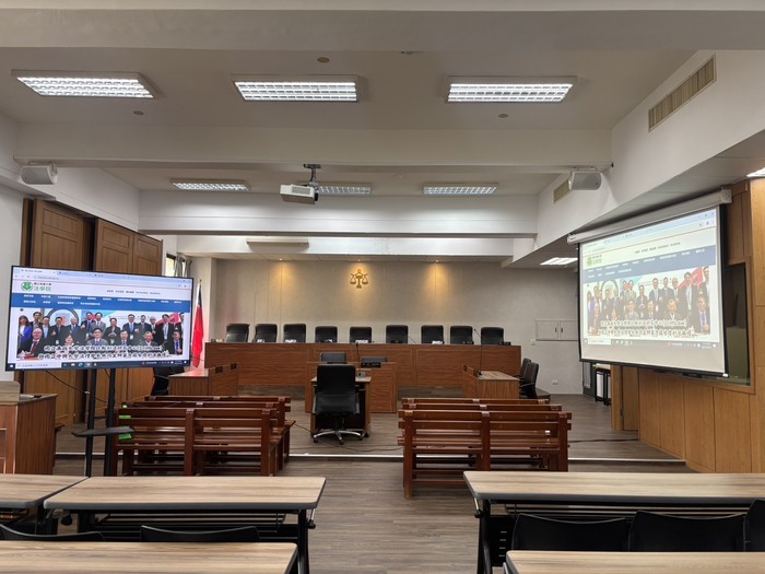 法學院208室模擬法庭繼去年完成法官席美化工程,本學期新增65吋LED螢幕,搭配原先調整位置的單槍投影機與布幕,在模擬法庭練習時右側的程序參與人終於可以在卷證以數位化提示時有較佳的工作觀察視野。208室有80席座位,此項新設備投入後也能優化多媒體授課的使用需求。208室在學期期間同時作為法律服務社的諮詢面談場。也將是12月中旬的2025 年首屆高大法學院杯南高屏高中職辯論賽的決賽場地,新設備投入後可提供更佳的教學輔助與即時活動訊息呈現。