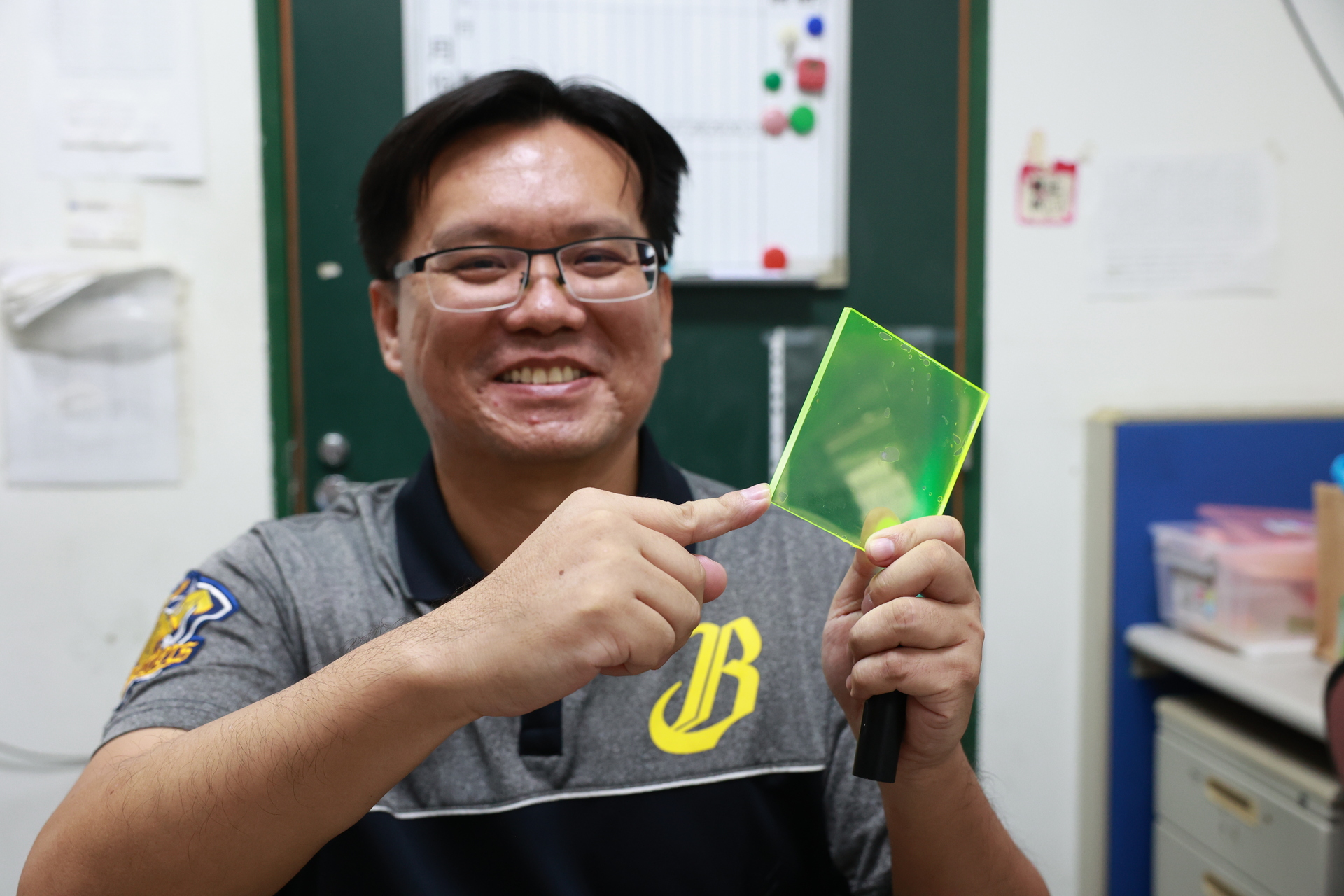 一支手電筒照向透明板材,板面隨即亮起鮮明螢光,光線沿著材料內部被導引至邊緣,小型太陽能板啟動、風扇開始轉動——這不是科幻場景,而是國立高雄大學應用化學系助理教授陳泓政團隊,近年投入研發的「螢光太陽能聚光器(Luminescent Solar Concentrator, LSC)」技術示範。