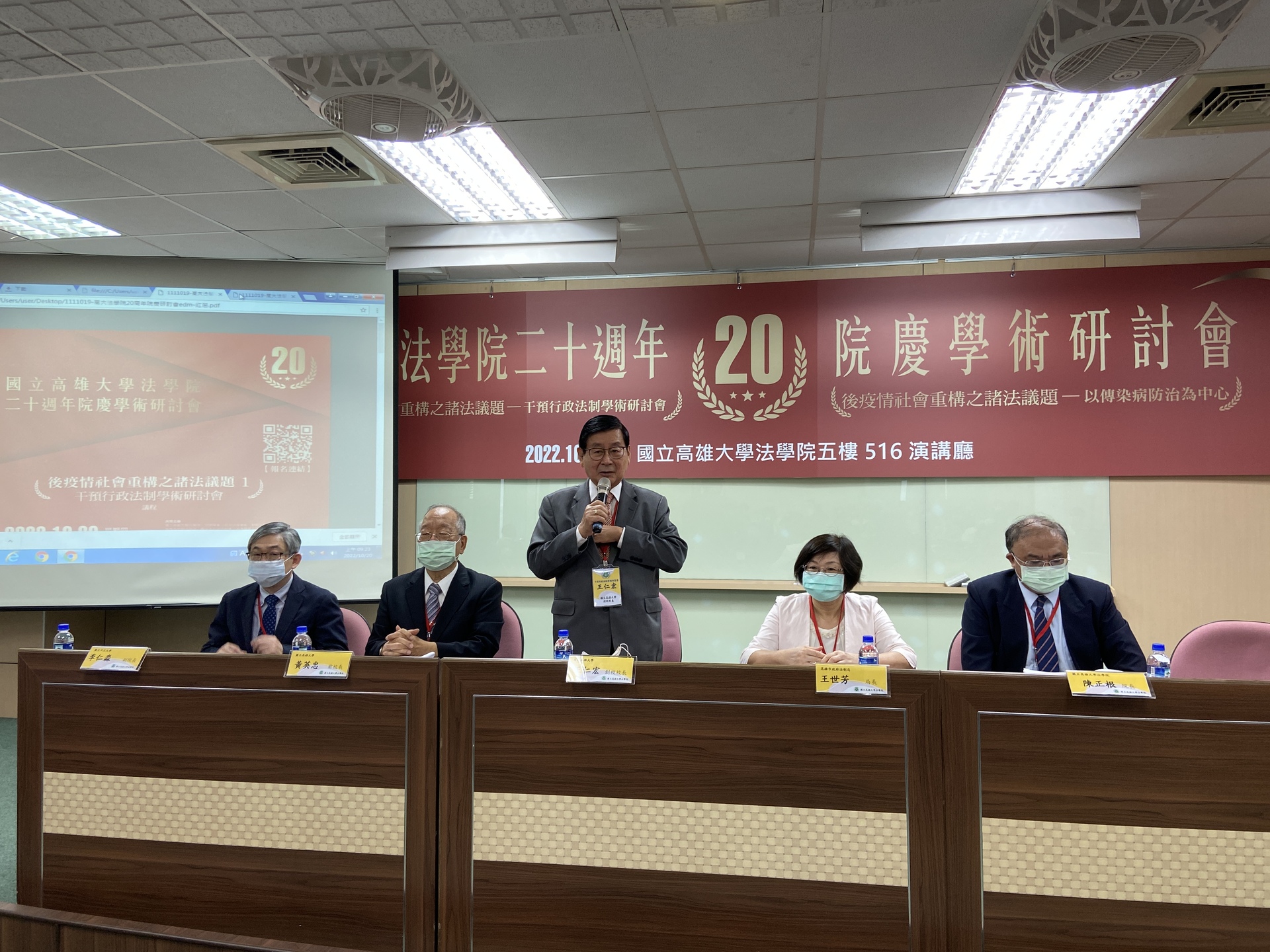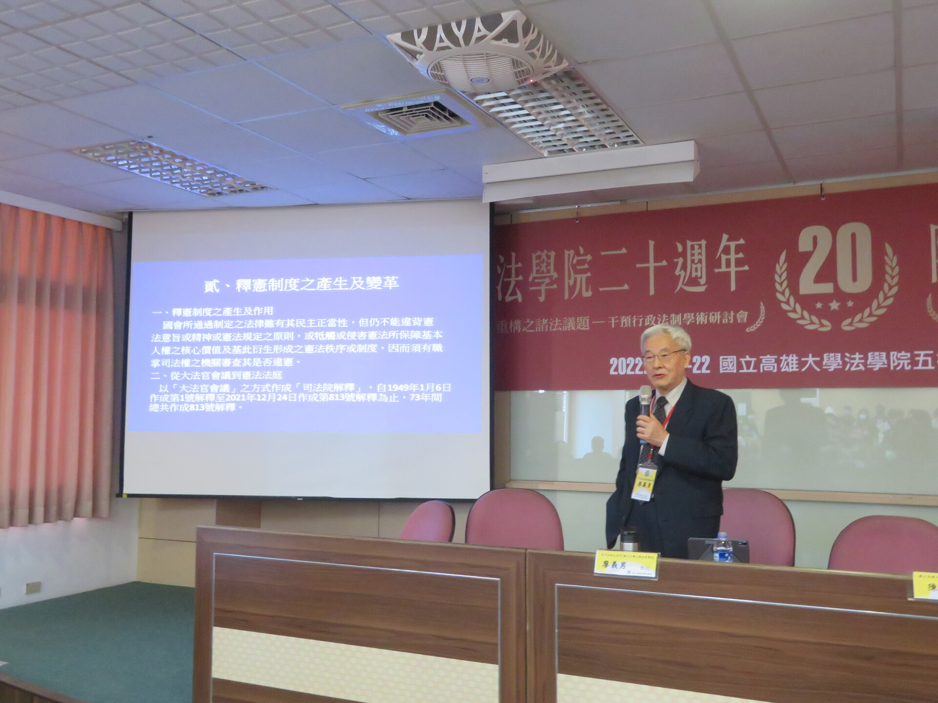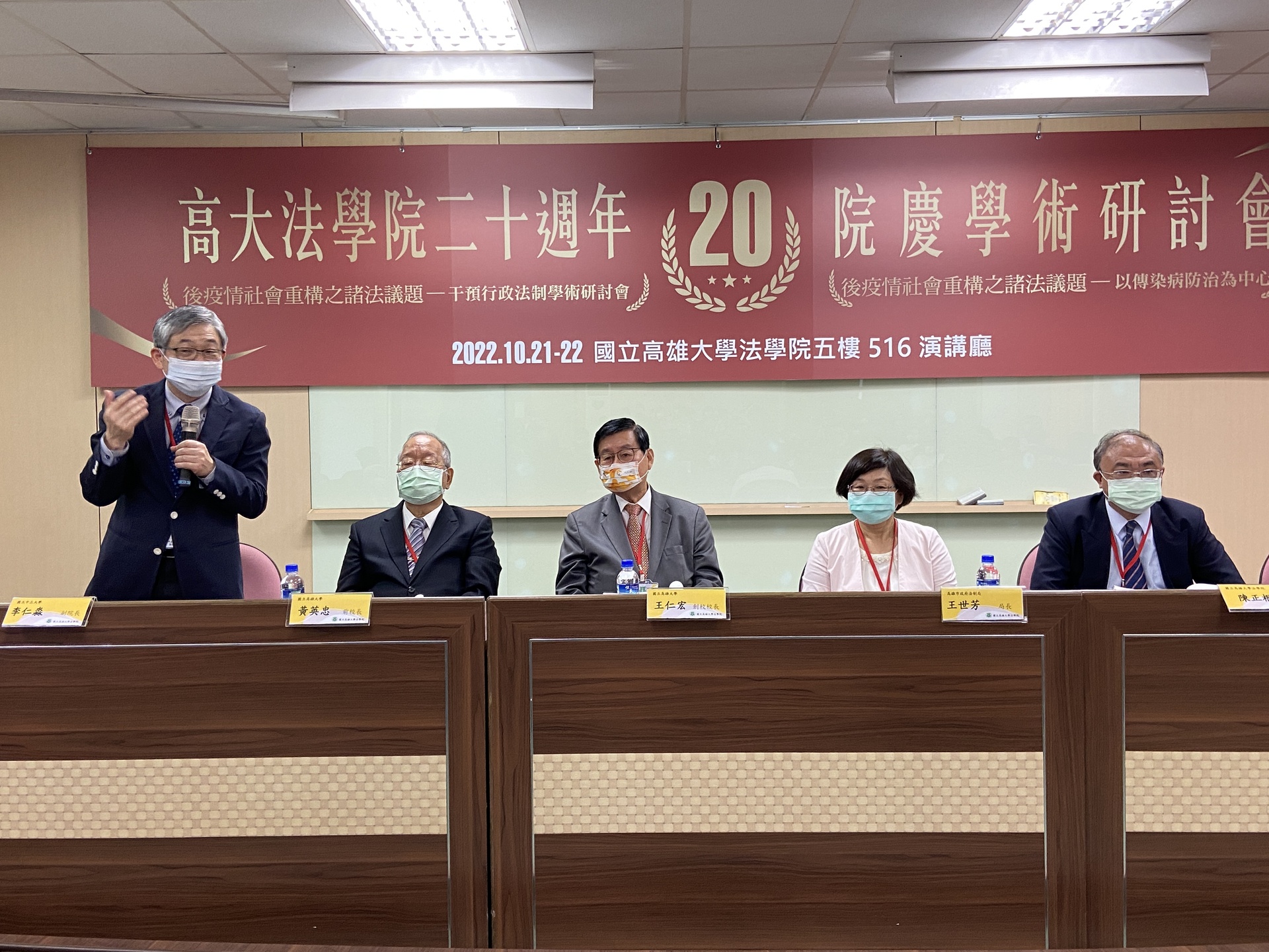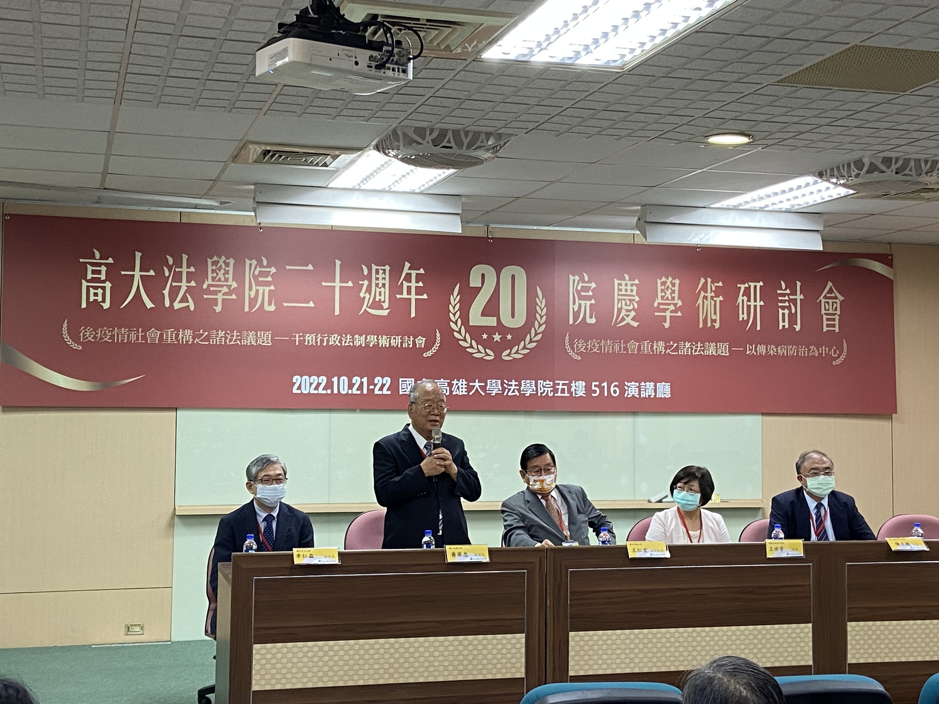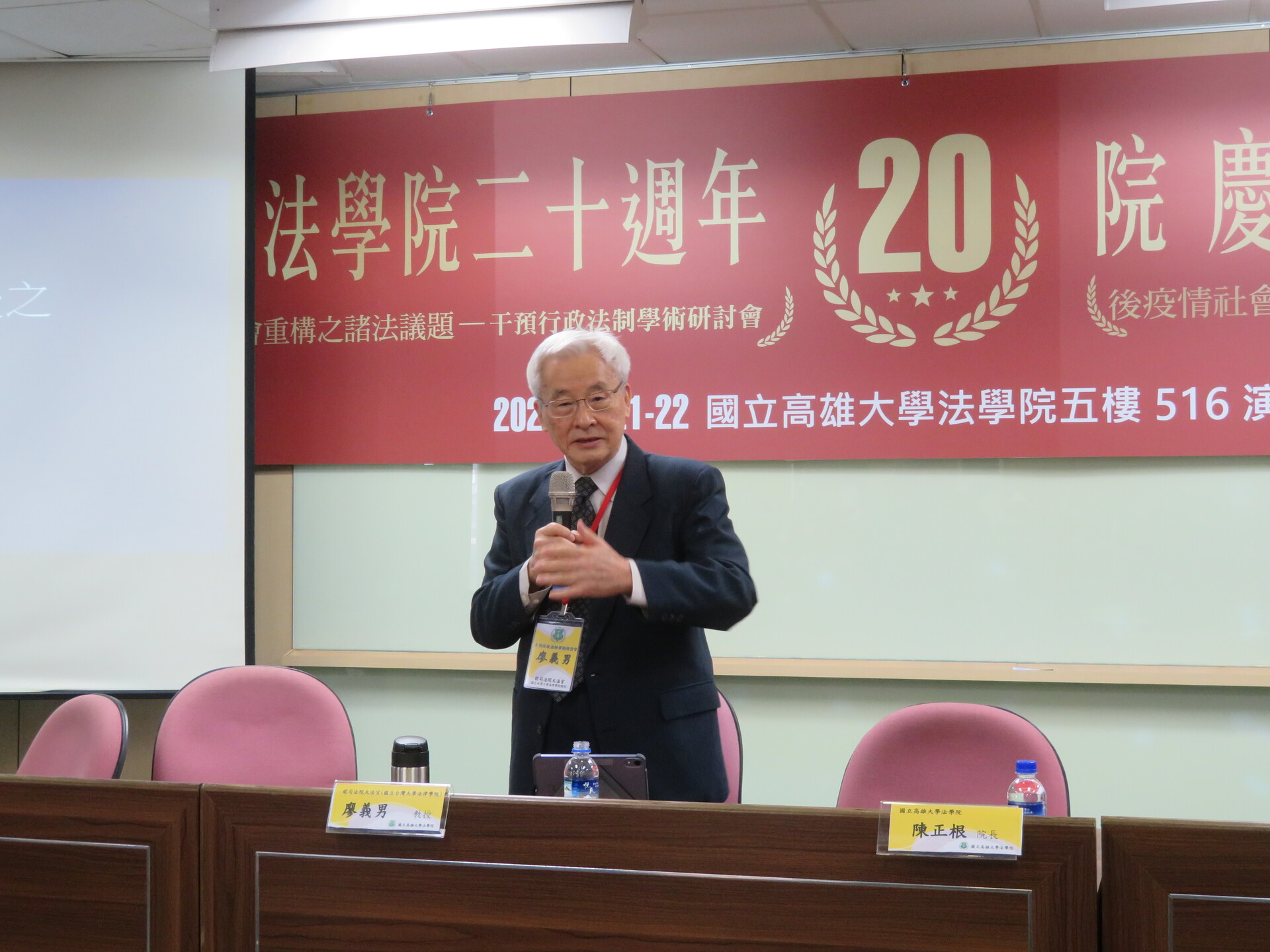 鑑於2020年以來,疫情席捲全球,終於今年漸露曙光,高雄大學法學院院慶特以「後疫情社會重構之諸法議題」為主題,第一天研討會聚焦於「干預行政法制」,特別邀請到司法院前大法官廖義男教授進行「憲法訴訟法施行後之違憲審查論理」專題演講,王仁宏創校校長、高雄市政府王世芳局長、黃英忠前校長、以及中正大學法學院李仁淼副院長亦特地前往致詞。