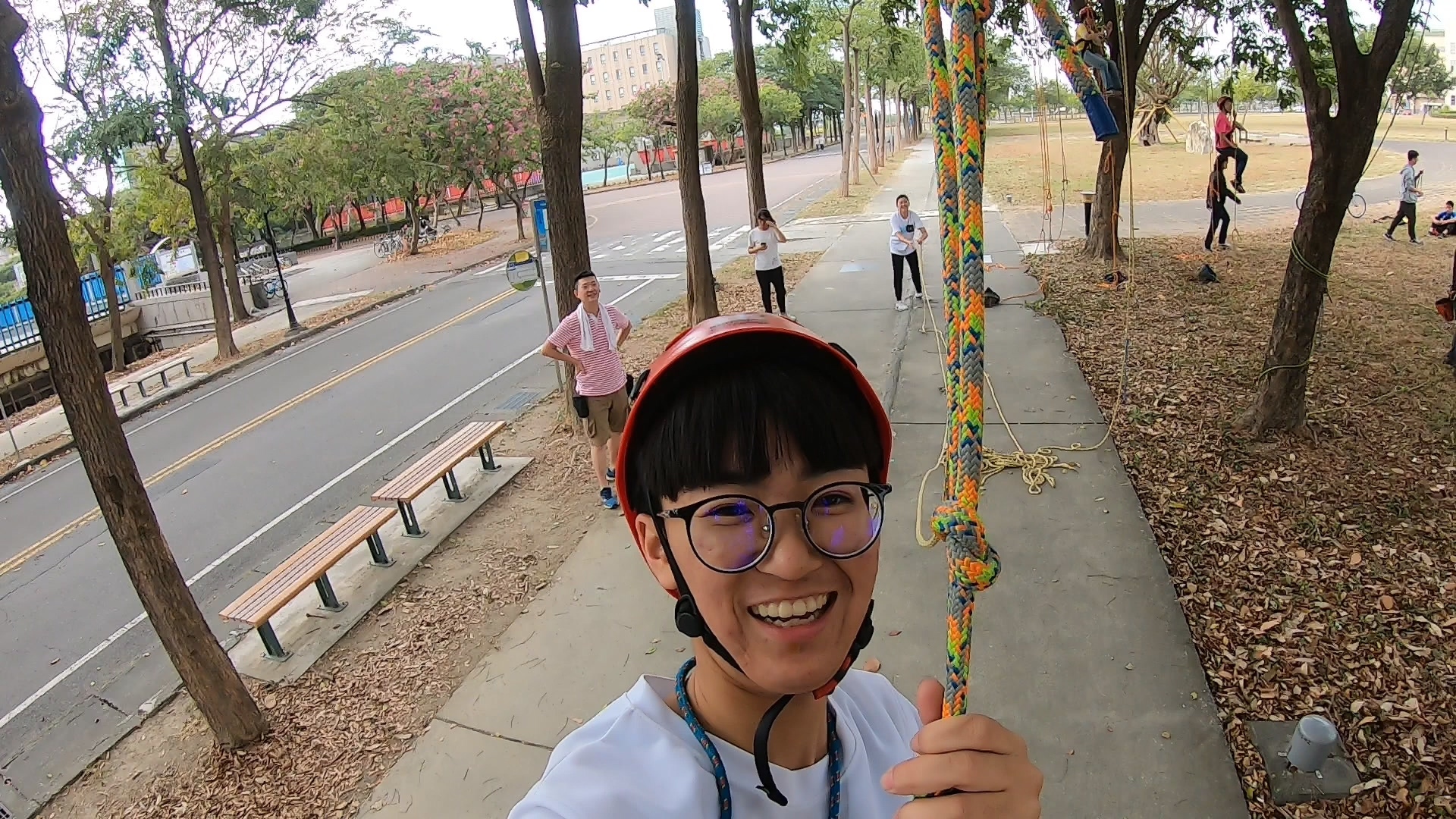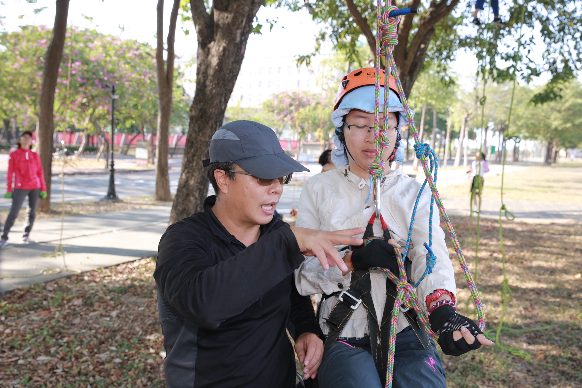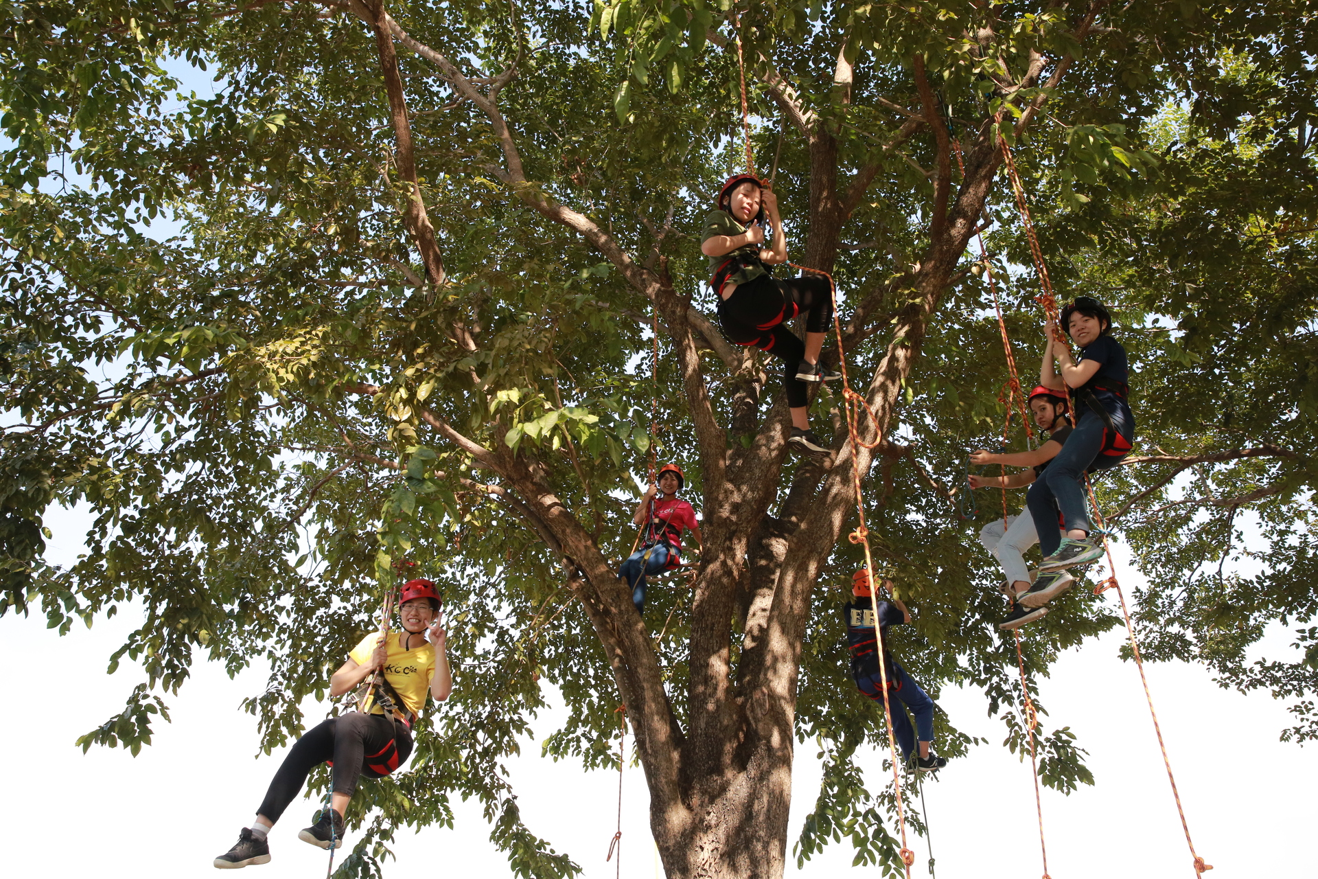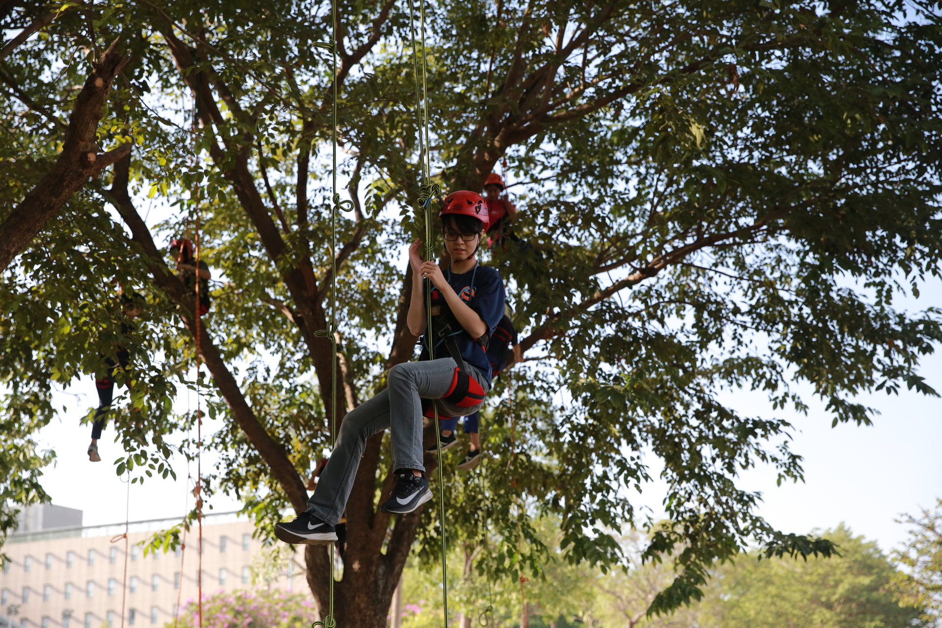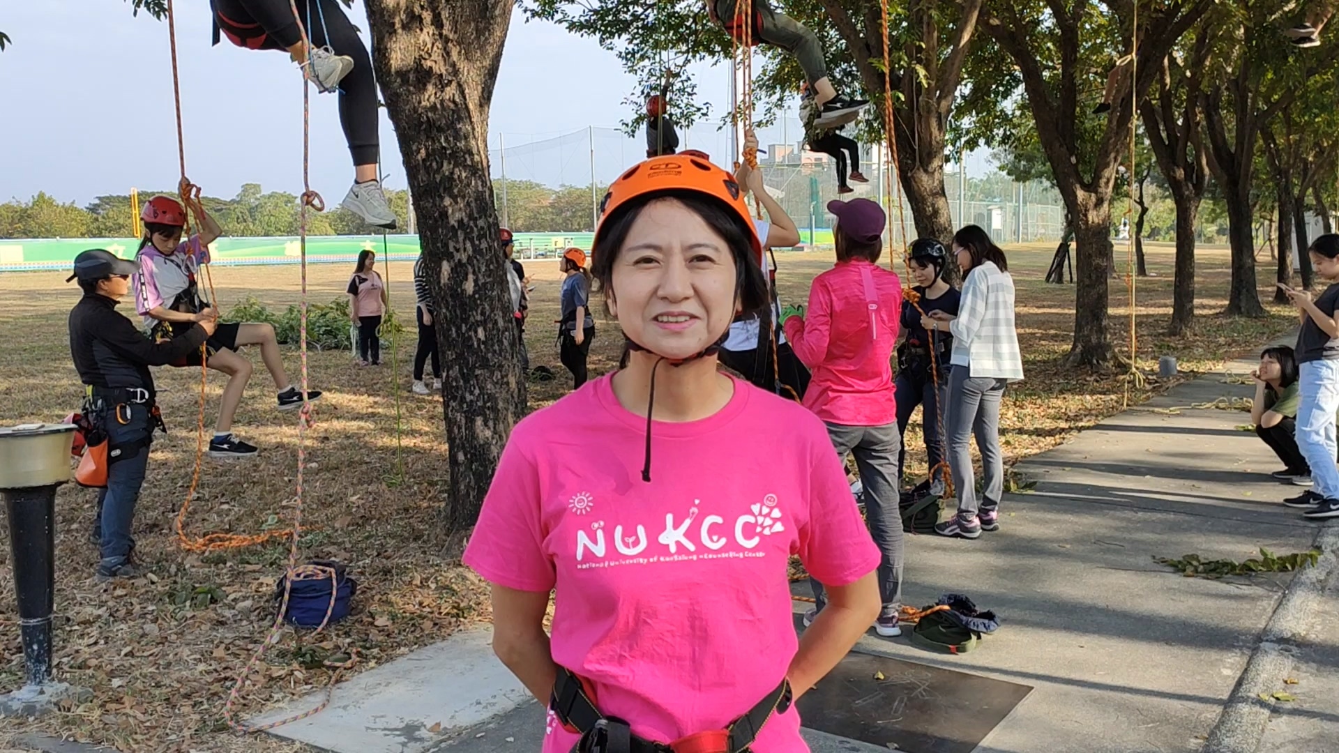 2019-12-30 心情鬱卒嗎?來攀樹(ClimbingTree)紓壓吧。國立高雄大學日前舉辦「攀樹趣~生命教育探索體驗工作坊」,由「樹藝師(Certified Arborist,CA)」李基源教導基礎繩結、攀樹、高空大擺盪等技巧,師生體驗當「泰山(Tarzan)」滋味,儘管氣喘吁吁滿身大汗,但克服恐懼爬上樹梢校園美景盡收眼底,成就感十足。「攀樹趣」工作坊由高雄大學學生事務處諮商與職涯發展組主辦,組長、運動健康與休閒學系副教授莊淑姿表示,「諮商輔導」不一定都得待在室內進行靜態式訴說與傾聽,「整個高大校園都是諮輔室」,並規劃各種活潑的情緒管理、壓力調適課程鼓勵師生參與共學。攀樹趣於焉產生,整日活動分為上午「團隊動力」及下午「攀樹」課程,前者訓練溝通與表達能力,後者則是安排攀爬、繩結技巧、團隊合作完成高空大擺盪等,兩課程結合讓學員學習與他人互動、共事與合作;攀爬過程學習面對內心不安恐懼並克服,以及認識樹種結構、自然生態,亦為生命教育、環境教育體現。攀樹活動甫推出,30個名額立即登記一空,且其中27名都是女學生。西洋語文學系杜文蔚說,圓了小時候想當樹木治療師的夢想,攀爬不若想像輕鬆且不單靠蠻力,相當有挑戰性。電機工程學系葉璦華熱愛戶外運動,曾有爬樹、攀岩經驗,對結繩不陌生,登頂樹梢迎來陣陣涼風與校園美景,捨不得下來。運動健康與休閒學系林俐圻也是玩上癮,不只來回兩趟,還吊掛半空擺盪玩起盪鞦韆享受快意。帶領師生體驗1日泰山的校外專家李基源,為「國際樹藝協會(International Society of Arboriculture,ISA)」認證的樹藝師。李表示,最初攀樹主要目的是執行樹木生理、生態、構造、分類及鑑別、修剪養護、栽植移植等任務,現在則演變為努力、毅力、挑戰、突破等冒險元素的運動,但前提均需由專業教練帶領並搭配周全器材設備保護樹與攀者安全。高雄大學諮商與職涯發展組因應大學生的生活和學習適應需求,主要業務包含導師生輔導、生命教育、情感敖育、生涯輔導和特殊學生輔導等5大項目。其中生命教育是人與自己、人與他人、人與自然的關係的探索和學習。