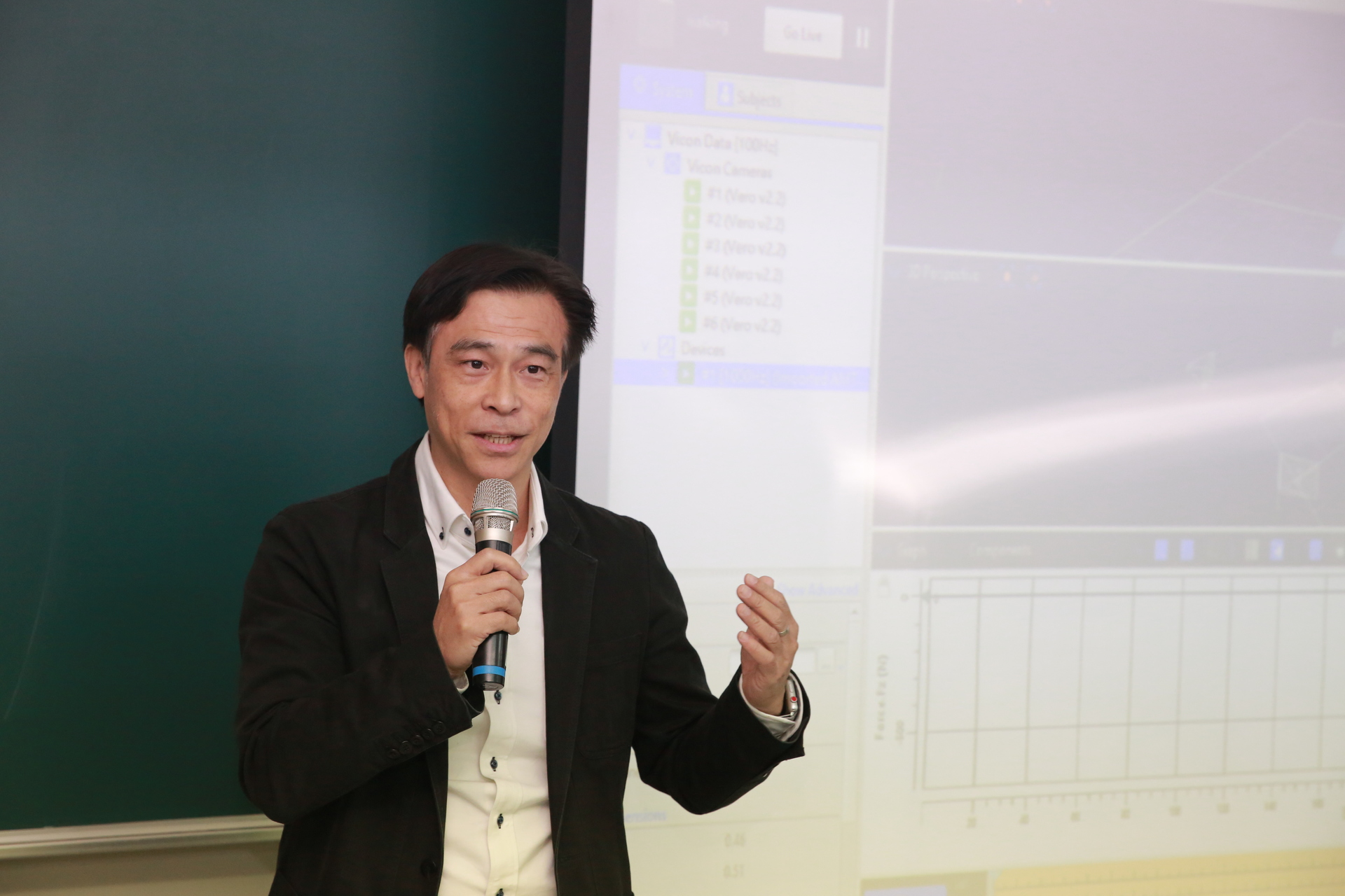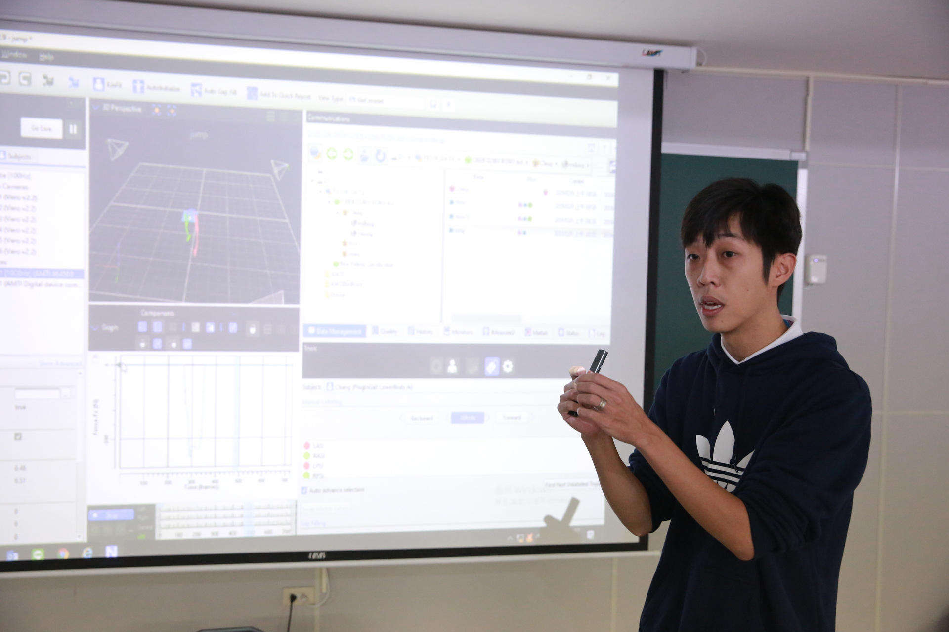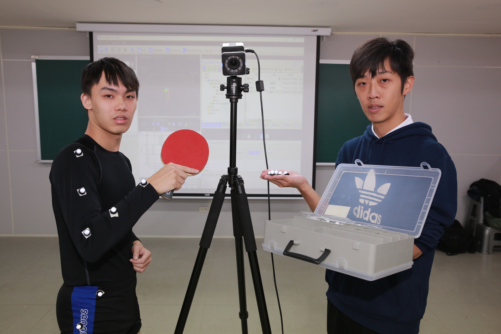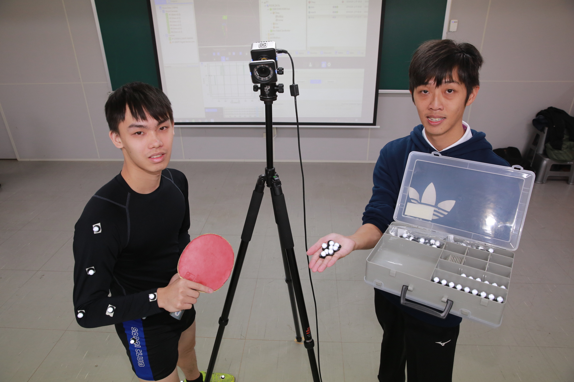 透過6台紅外線高速攝影機、1組測力板,依照檢測運動項目(如桌球)在受測者主要活動部位貼上若干「反光標誌(reflective mark,俗稱反光球)」,以每台攝影機每秒拍攝300張圖像,與踩踏測力板產生的反作用力數值,精準記錄運動過程,誤差僅2mm,加以分析綜合評估,協助提升運動表現,甚或矯正錯誤姿勢、避免運動傷害。