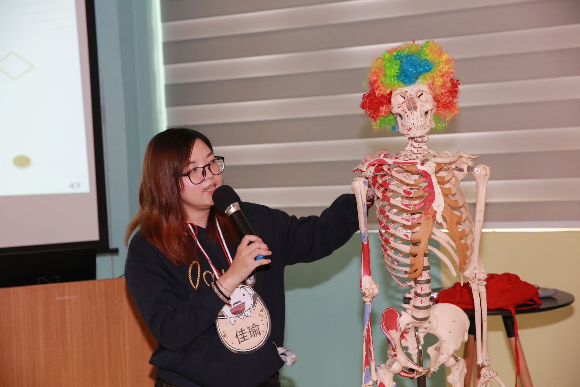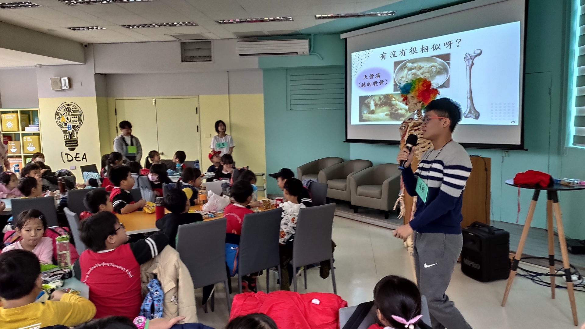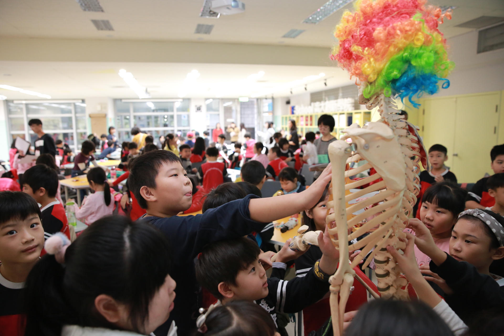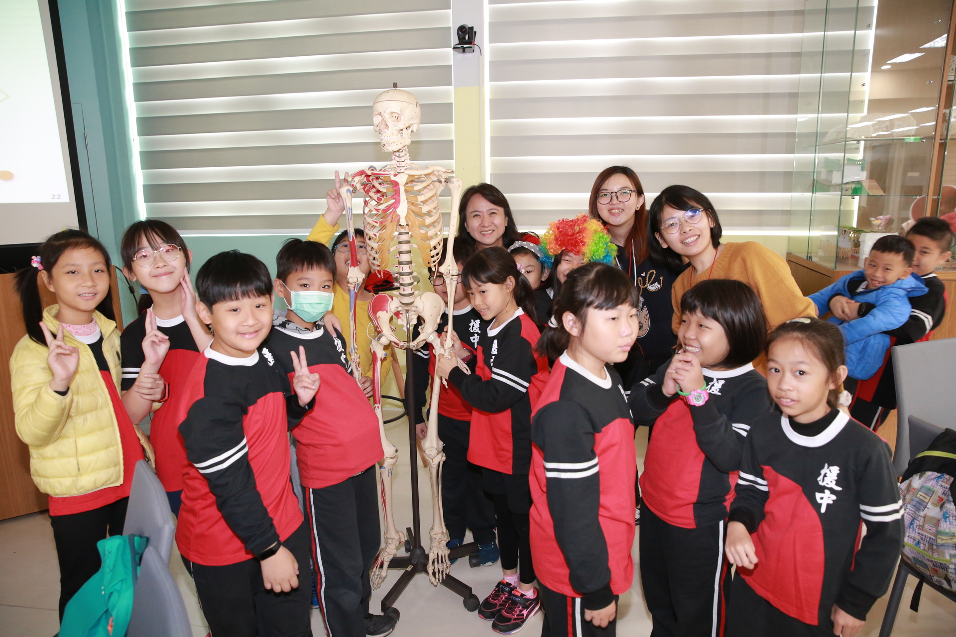 2019-12-11 「考考小朋友,這是什麼骨?」國立高雄大學運動健康與休閒學系師生日前邀請鄰近援中國小學童參加「1日大學生」體驗,特別搬出「史密斯先生」教導認識人體骨骼架構,以及手作「小小史密斯」紙偶加深印象,進而養成良好姿勢習慣與預防運動傷害。