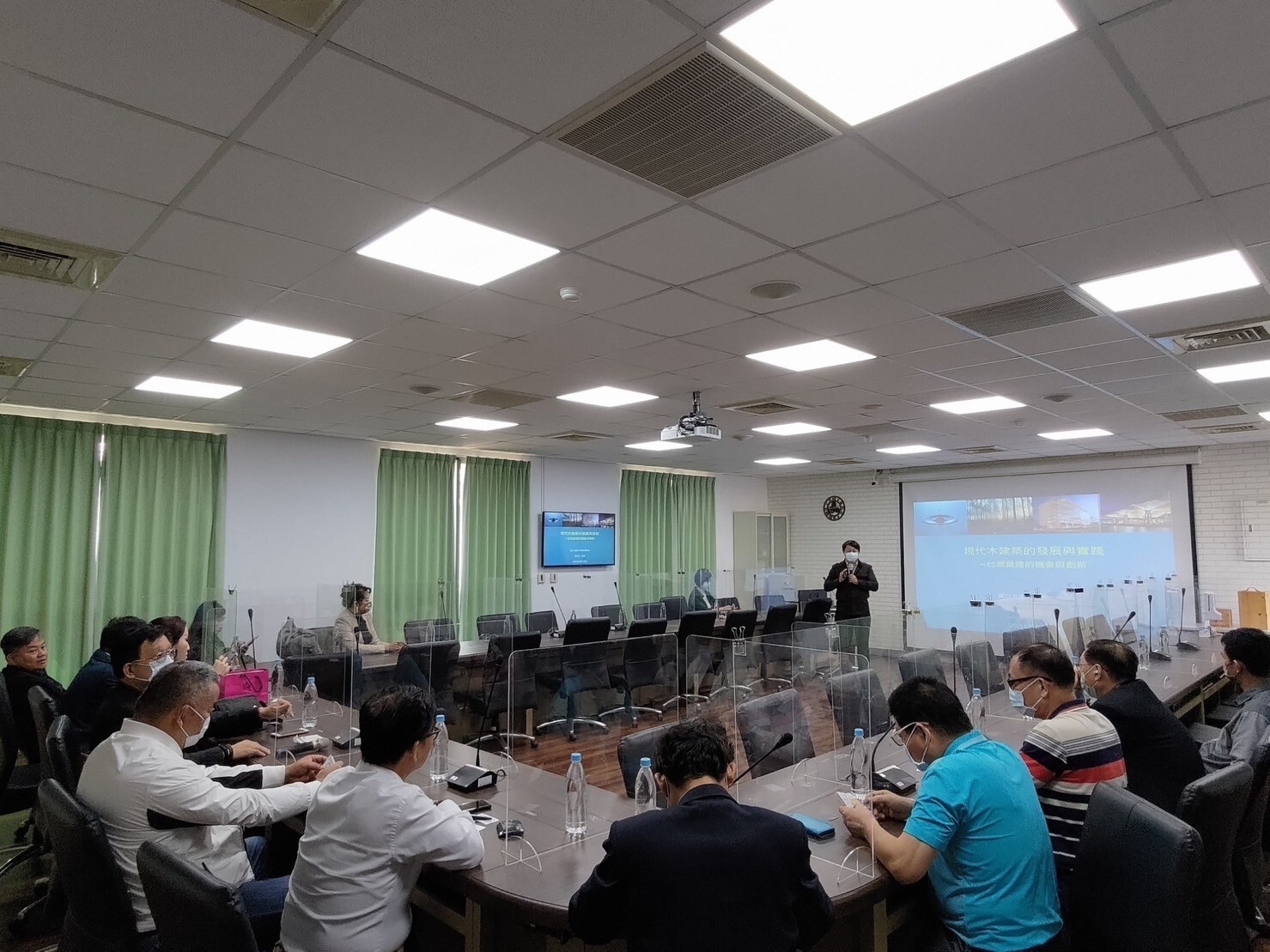 三月二日下午,由高雄市經貿發展協會蔣權瀚總幹事及各界企業先進們,共計14人組成的團體參訪高雄大學,首先由人文院賴怡秀院長及建築學系陳怡兆主任致詞歡迎,說明高雄大學人文院與建築學系致力於人文科技並重的教學與研究,除了累積豐沛的教學研究成果外,更有能力以實際成果展現對於當代全球議題的關注與回應。隨即由建築學系陳啓仁教授進行了四十分鐘的演講簡報,由2050淨零轉型得國家政策、產業轉型結合企業ESG發展面向,到國際間低碳木構造建築的發展趨勢與願景,得到了與會貴賓們的熱烈回饋與交流。參訪貴賓隨即轉往校園西面的木構造示範場域,由陳啓仁老師導覽,進行實體成果之觀摩及參訪。